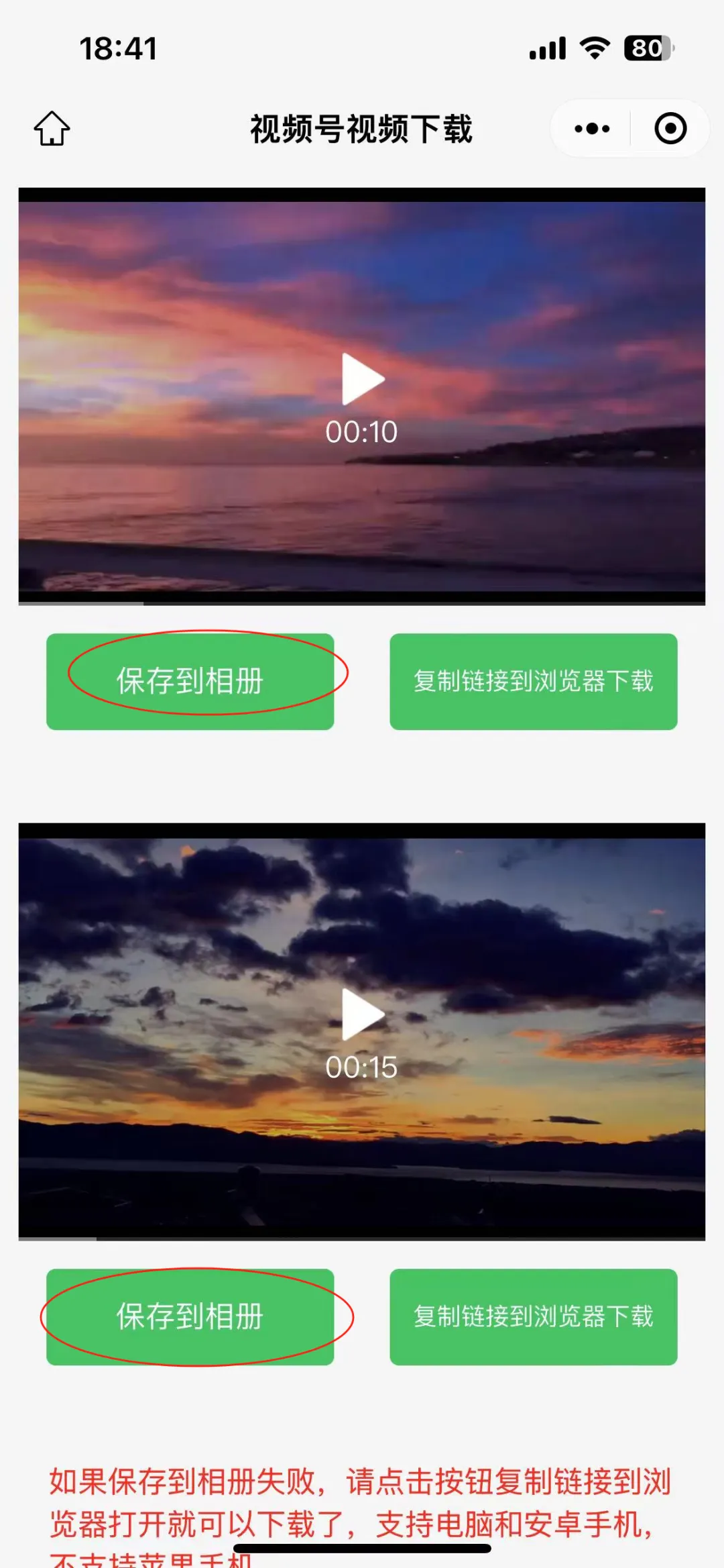 复制链接然后用浏览器访问并下载。如果存在多个mp4文件,可以试着挨个打开播放下,里面会有你需要的视频文件。注意下,如果公众号里引用的腾讯视频,则该方法可能无法成功,需要下载官方客户端。