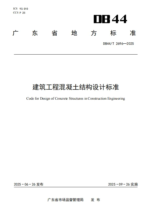 根据广东省住建厅2025年9月1日通告,广东现行高层建筑混凝土结构设计地方标准为《建筑工程混凝土结构设计标准》, 公开标准号:DB44/T 2696—2025