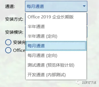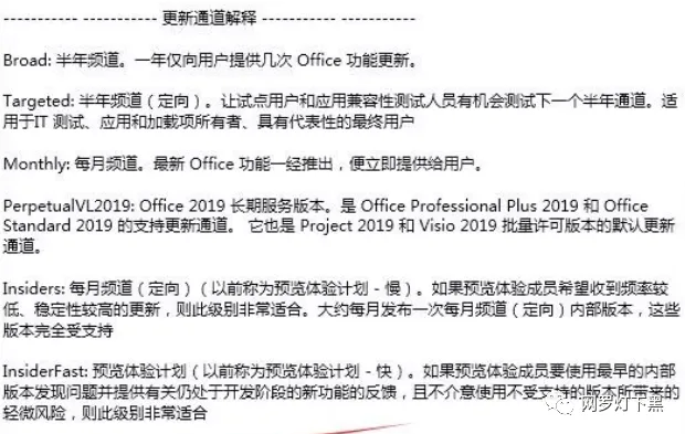 这是之前的版本对更新通道的解释。如果安装的是 Office 2019, 必须选择 Office 2019 企业长期版,其它版本建议选择每月通道就行。
