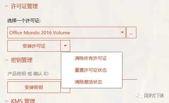 在安装许可证之前建议先清除所有许可证。这里主要为了清理旧的 Office 激活信息,避免出现激活信息不正确的问题。如果之前没有装过,那可以省去这一步。