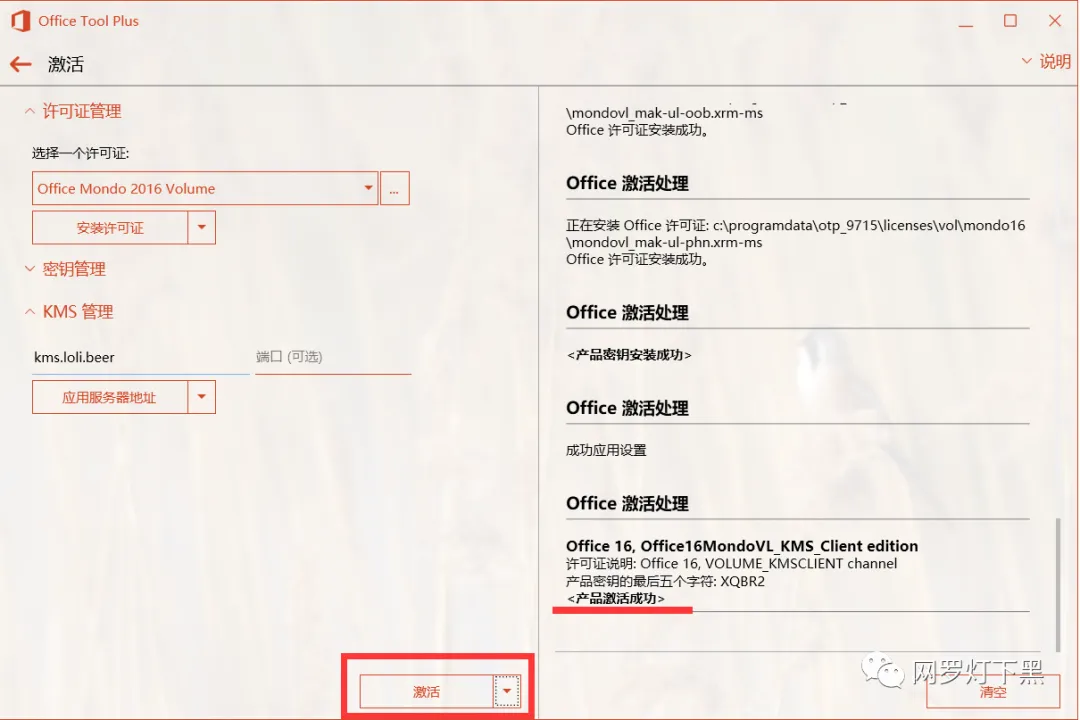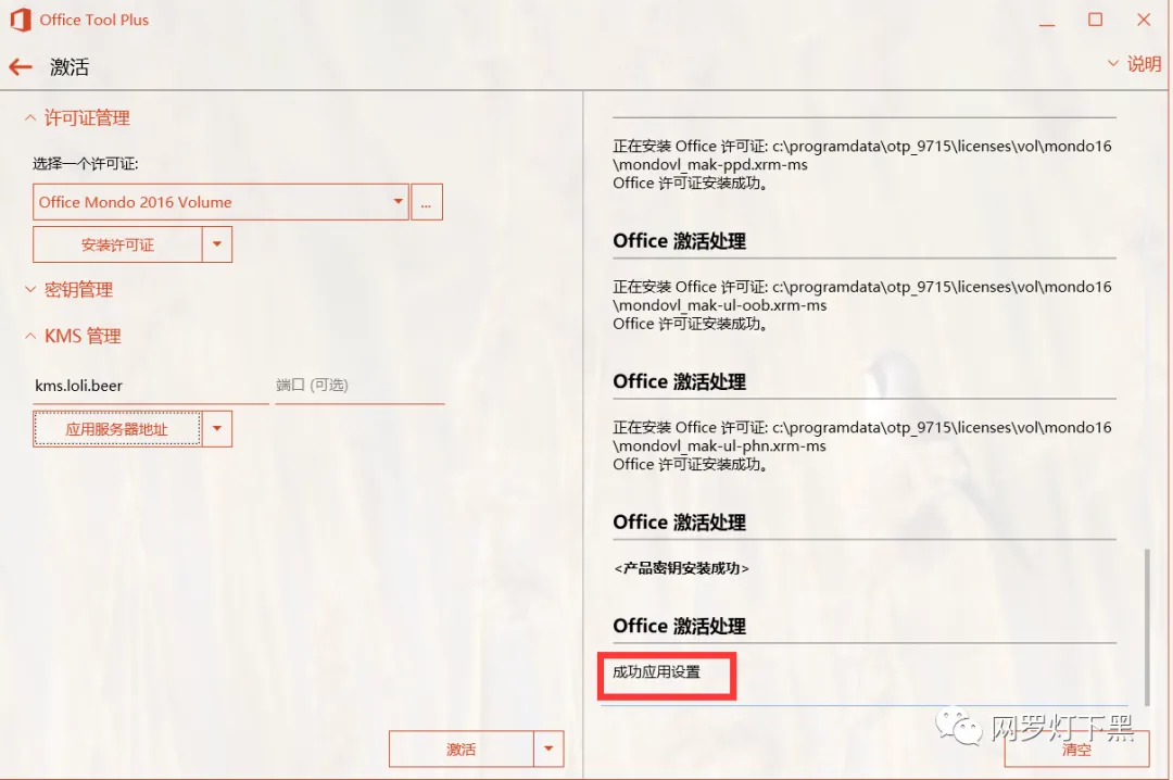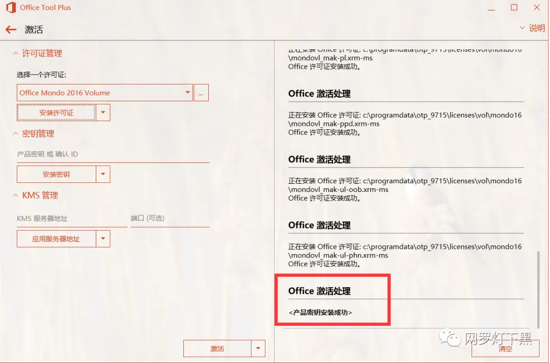 然后再选择默认的 Office Mondo 2016 Volume,安装许可证。会有提示许可证安装成功的提示。