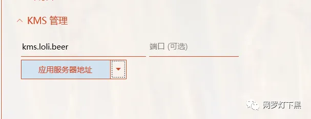 安装之后开始设置 KMS,输入服务器地址,例如 kms.loli.beer ,端口不管,再点击应用服务器地址。