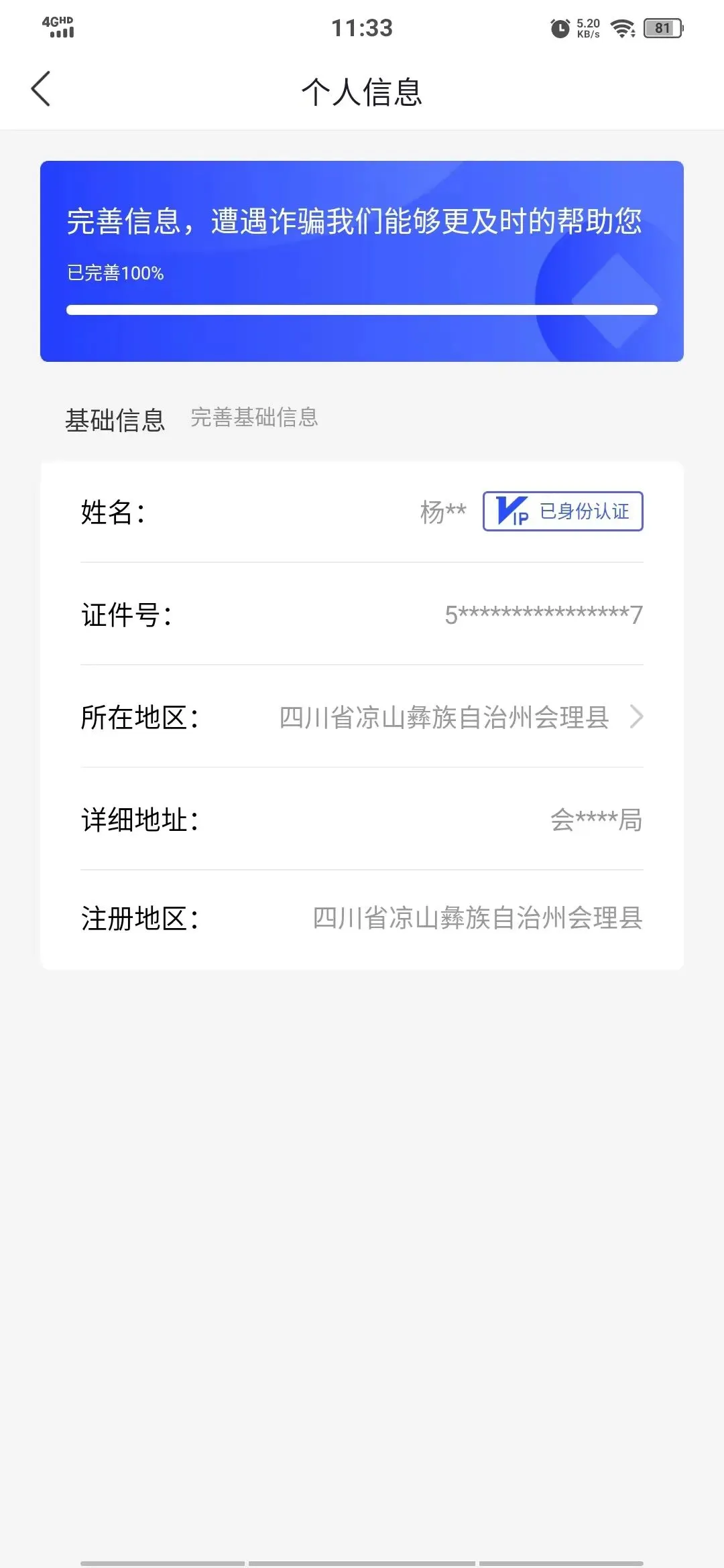 4、务必完善个人身份信息(下图所示为身份信息已全部完成页面)。