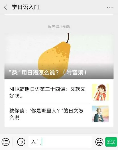 2、关注后,在“学日语入门”微信号的对话框内回复“入门”两字(不带引号):