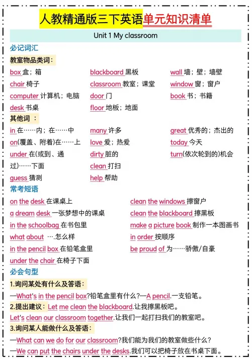 【免费下载】三年级(下)英语 1-6单元知识清单《人教精通版》,PDF电子版,可打印
