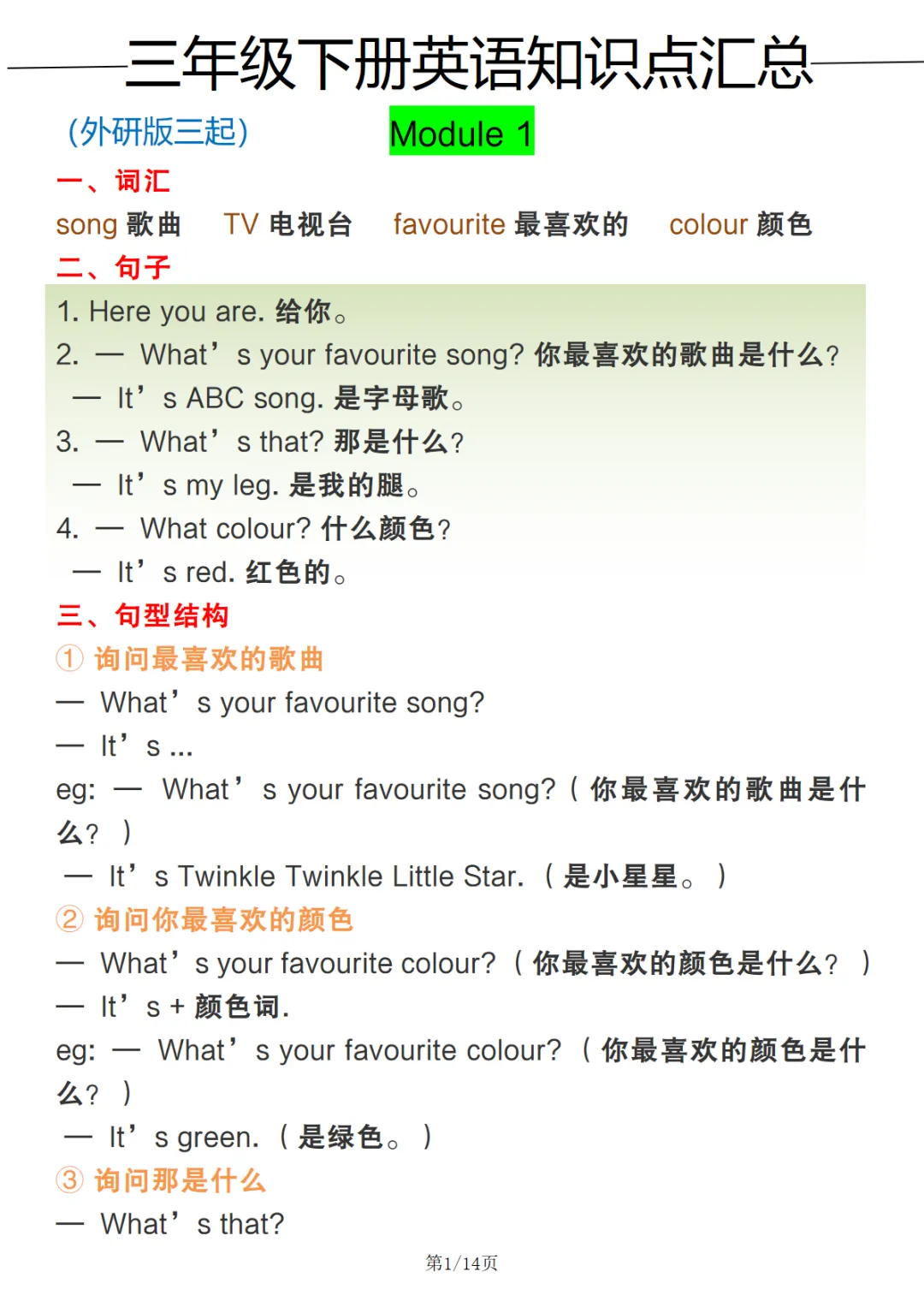 【免费下载】三年级(下)英语 全册知识点汇总《外研版(三起)》,PDF电子版,共14页,可打印