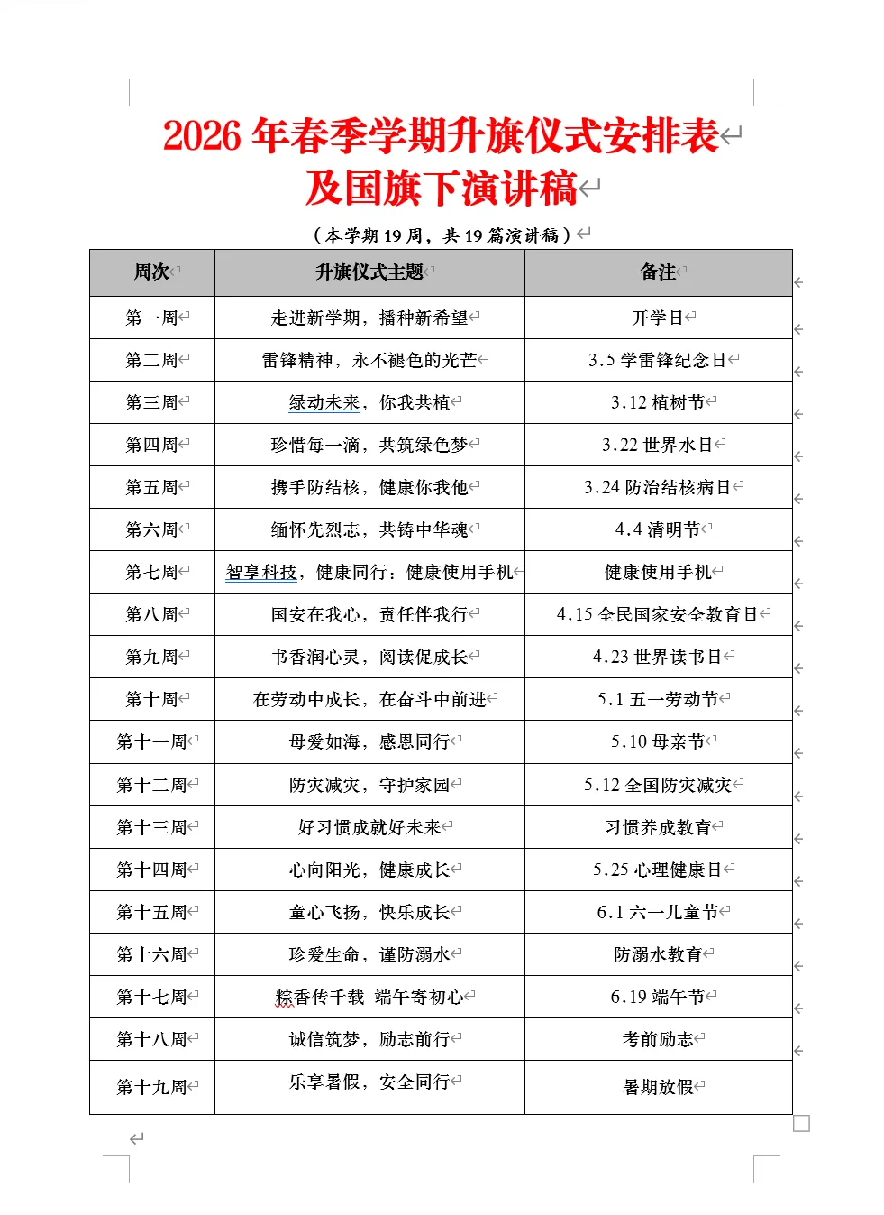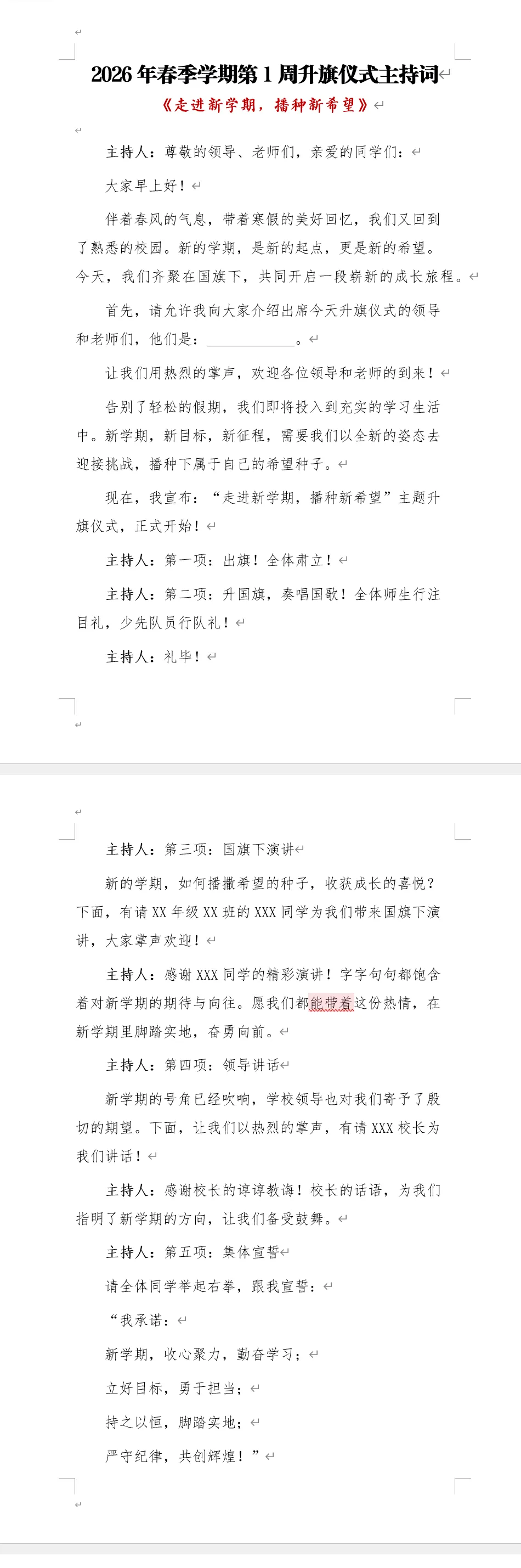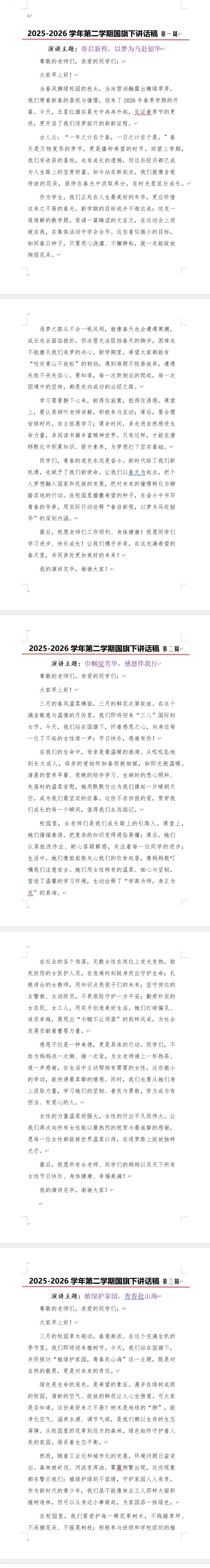 本期为老师们带来的是2026年春季学期升旗仪式安排表及国旗下讲话稿以共有两个版本,都是word版本可以编辑,另外两个是国旗下讲话的主持人讲稿,也是word版本。