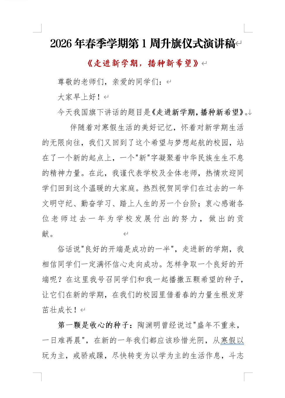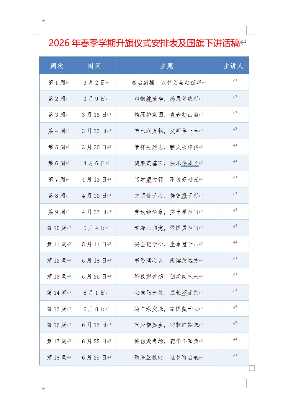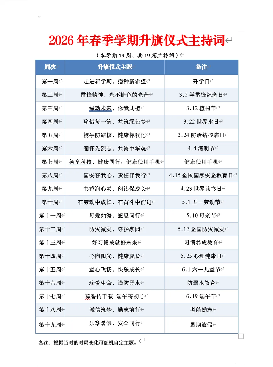 本期为老师们带来的是2026年春季学期升旗仪式安排表及国旗下讲话稿以共有两个版本,都是word版本可以编辑,另外两个是国旗下讲话的主持人讲稿,也是word版本。