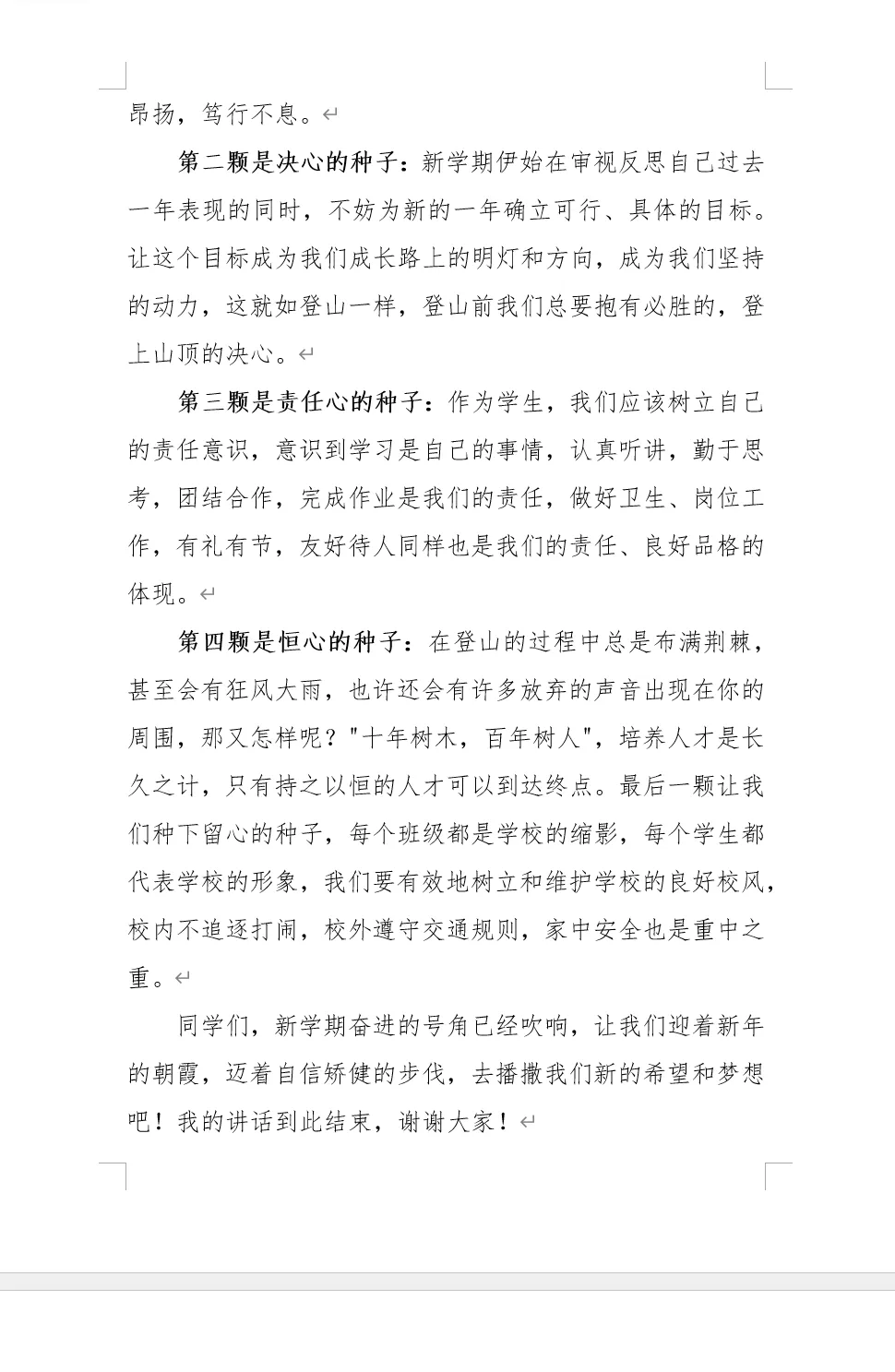 甲:感谢XX同学的精彩发言。收心、决心、责任心、恒心、留心,这五颗种子,是我们新学期成长的秘诀。