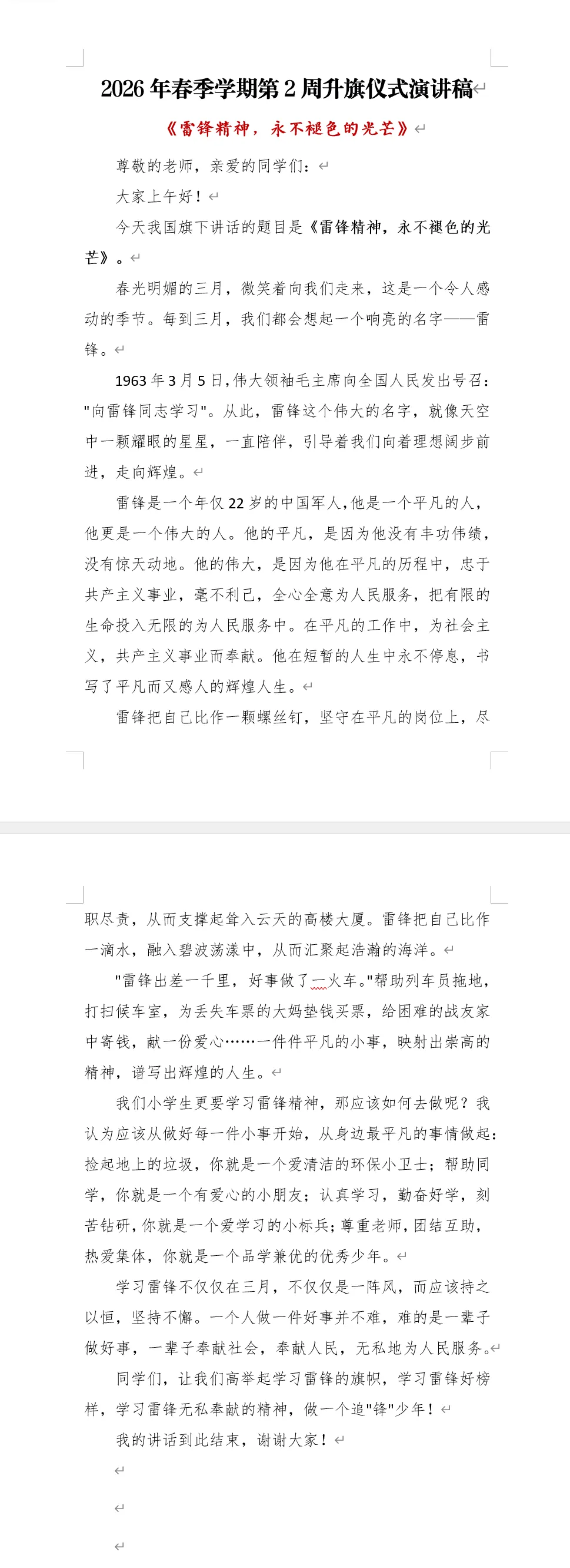 老师们,同学们,雷锋精神永不过时,它是时代的丰碑,是我们宝贵的精神财富。让我们把雷锋精神融入日常,用行动践行初心,让这个春天因我们的善意而更加温暖。