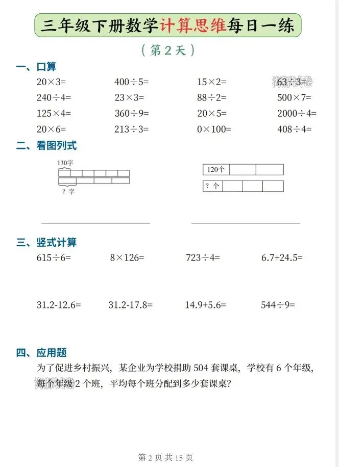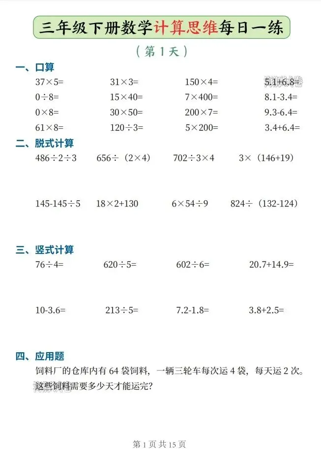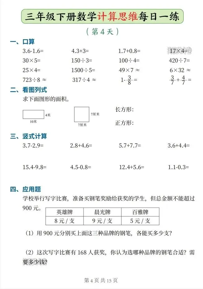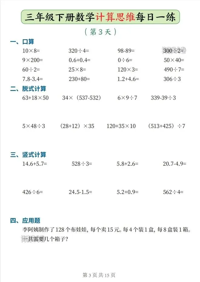 今天给大家整理了三年级数学下册计算思维每日一练),转发给朋友或班级群,受益更多人,帮助孩子学习!