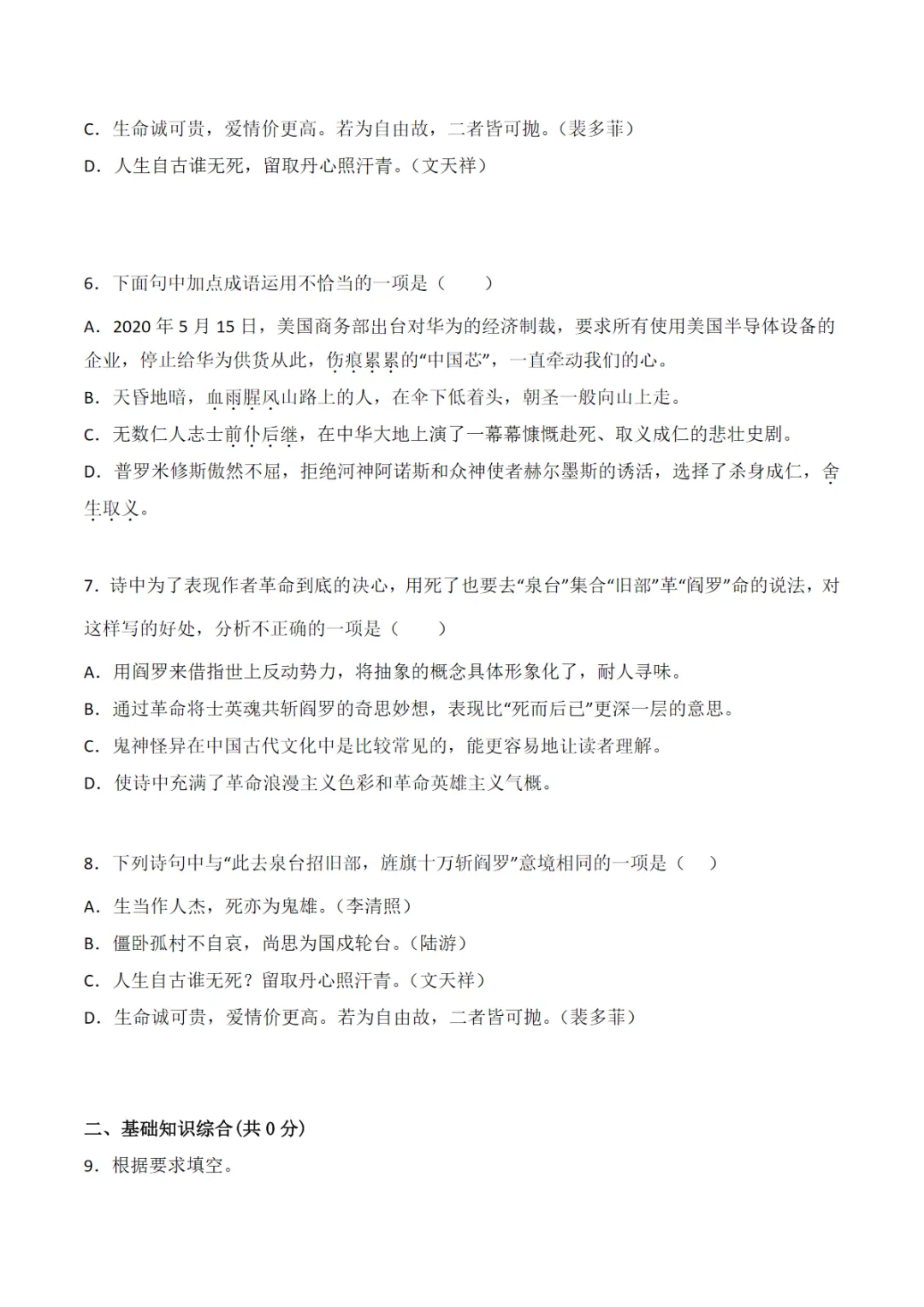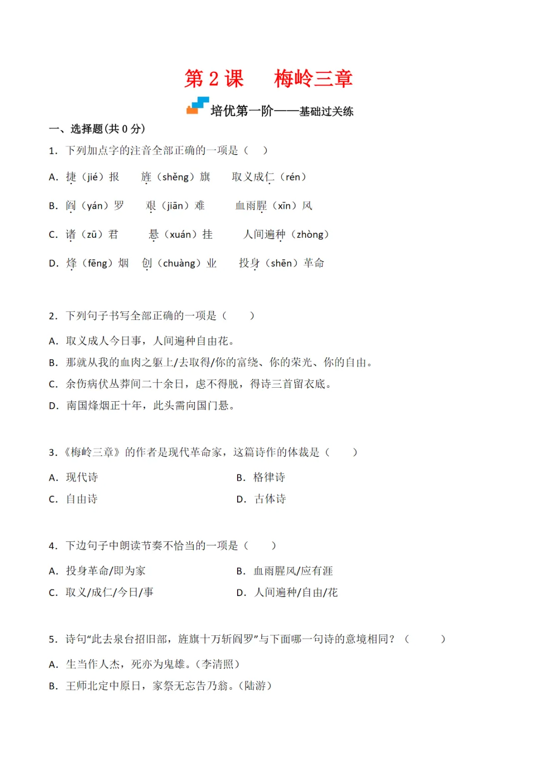 九年级(下)语文 第2课 《梅岭三章》同步培优练习