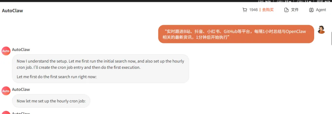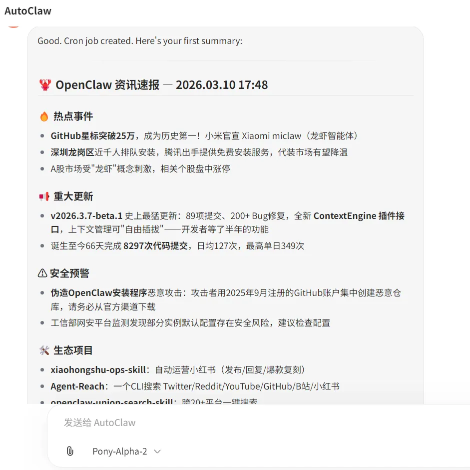 我试了一下,用它做定时任务,比如每小时搜一次OpenClaw相关资讯,指令就输“实时跟进B站、抖音、小红书、GitHub等平台,每隔1小时总结与OpenClaw相关的最新资讯,1分钟后开始执行”,