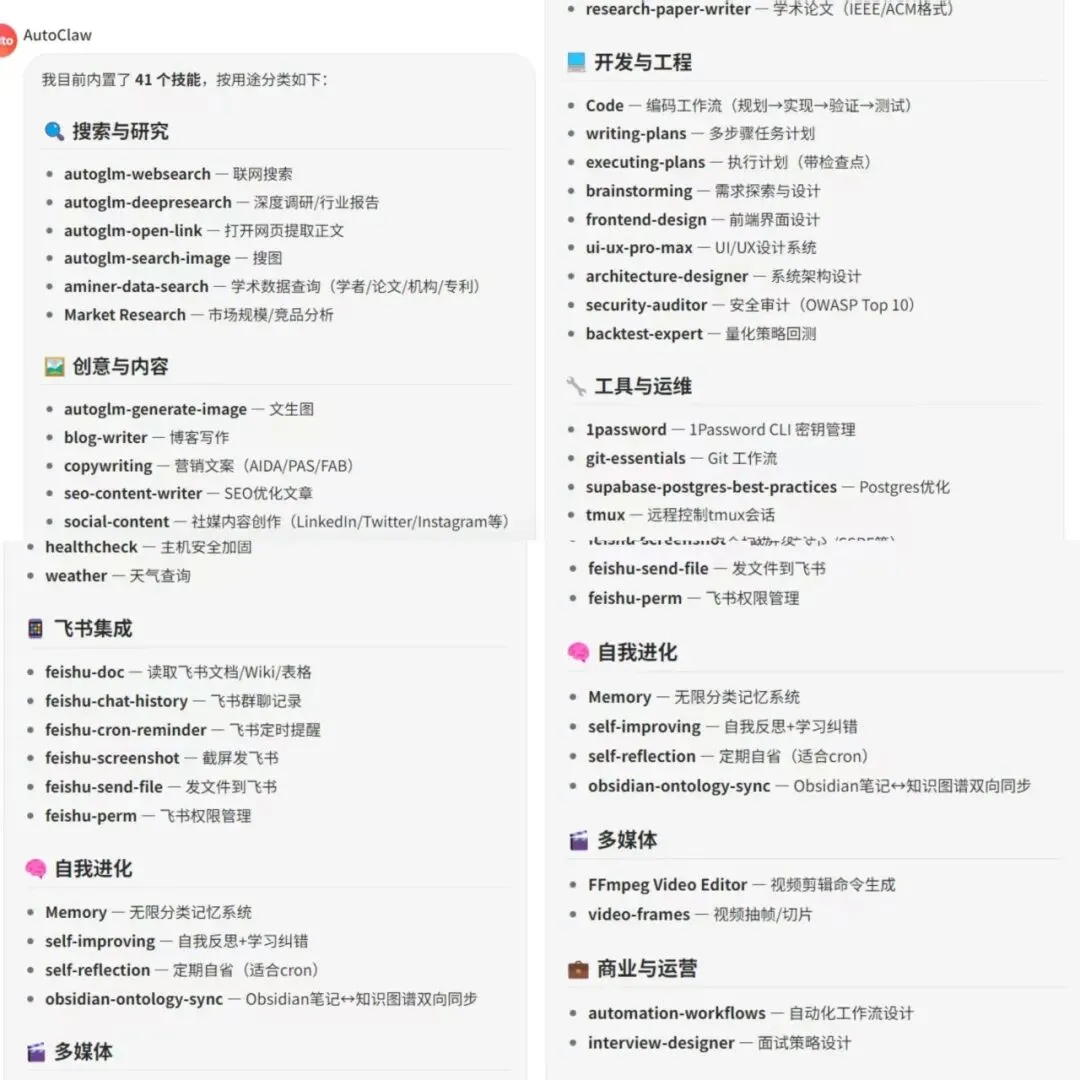 同时它内置了四十多个技能,相当于给你配了一整个“龙虾战队”,不用你自己去瞎配置接口。