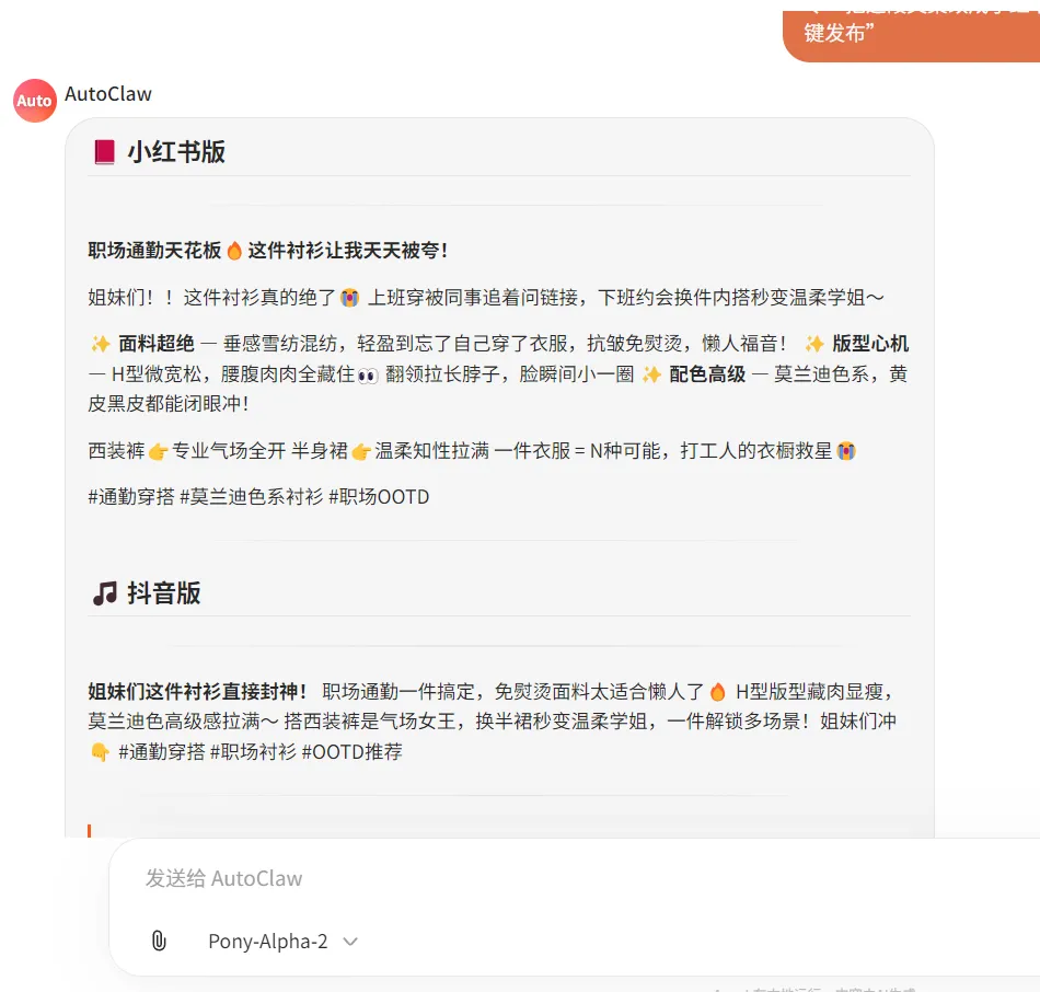 我测试了两个高频场景,第一个是运营必备的多平台发布:给它一段产品文案,