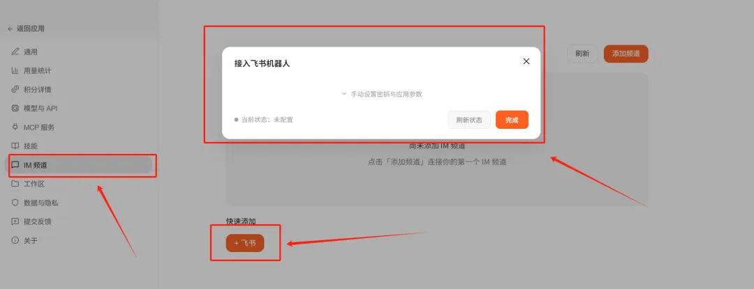 更绝的是它能一键接入飞书,不用单独打开复杂的后台,就像给同事发微信一样。