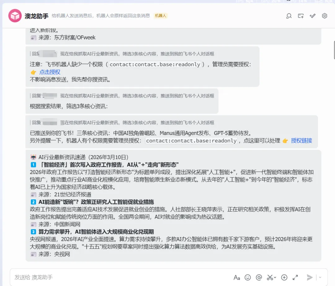 我实测了定时推送资讯:指令“现在给我抓取AI行业最新资讯,筛选3条核心内容,推送到我的飞书个人对话框”,到点它真的准时推送,每条资讯都带来源和核心摘要,连相关链接都附上了,不用我再去各个平台搜。