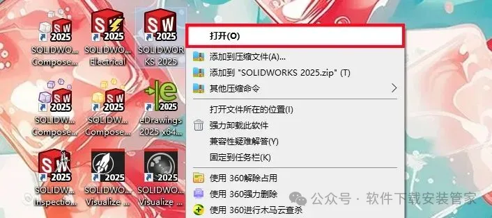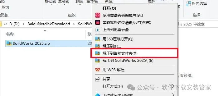 1.打开下载的SolidWorks 2025软件安装包,鼠标右击压缩包选择【解压到当前文件夹】。