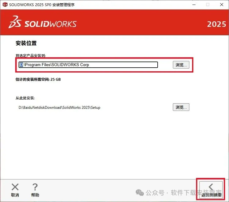 20.软件默认安装路径为系统C盘里,点击【浏览】可更改安装路径,可在D盘或者其它磁盘中新建一个【SolidWorks 2025】文件夹,然后选中后点击【选择文件夹】。然后点击【返回到摘要】。