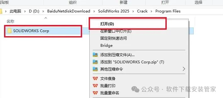 25.返回到解压的【SolidWorks 2025】文件夹中,然后打开【Crack】文件夹。