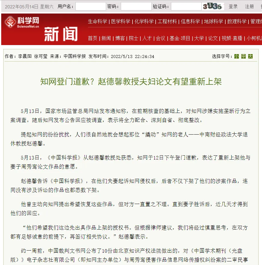 昨晚《中国科学报》于科学网上发文表示,该报记者从赵德馨教授处获悉,知网于12日下午登门道歉,表达了重新上架他与妻子周秀鸾论文作品的意愿。