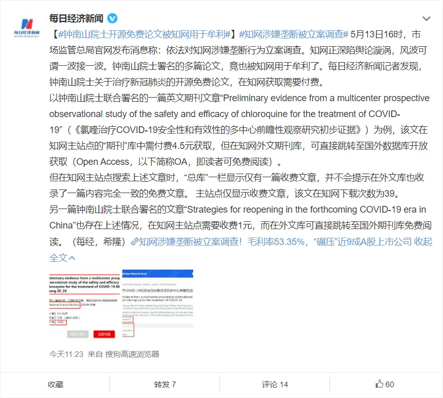 钟南山院士署名的多篇论文,竟也被知网用于牟利了。每日经济新闻记者发现,钟南山院士关于治疗新冠肺炎的开源免费论文,在知网获取需要付费。以钟南山院士联合署名的一篇英文期刊文章“Preliminary evidence from a multicenter prospective observational study of the safety and efficacy of chloroquine for the treatment of COVID-19”(《氯喹治疗COVID-19安全性和有效性的多中心前瞻性观察研究初步证据》)为例,该文在知网主站点的“期刊”库中需付费4.5元获取,但在知网外文期刊库,可直接跳转至国外数据库开放获取(Open Access,以下简称OA,即读者可免费阅读)。
