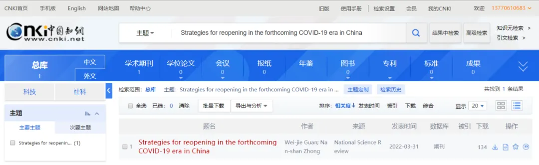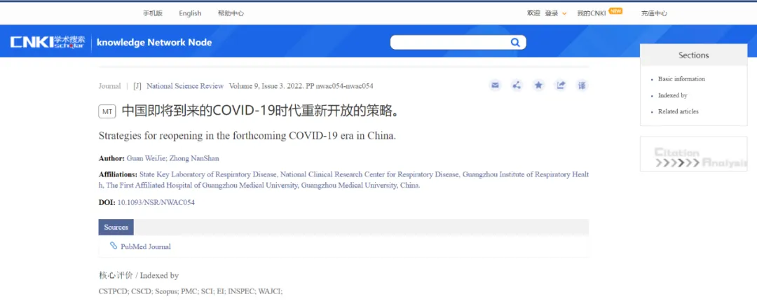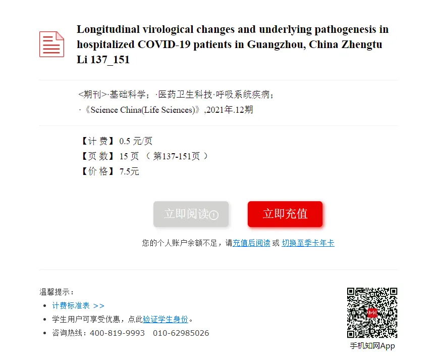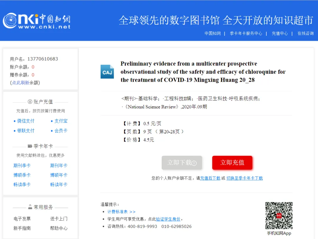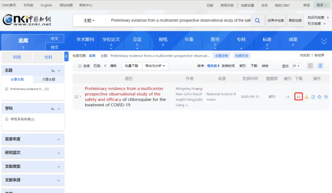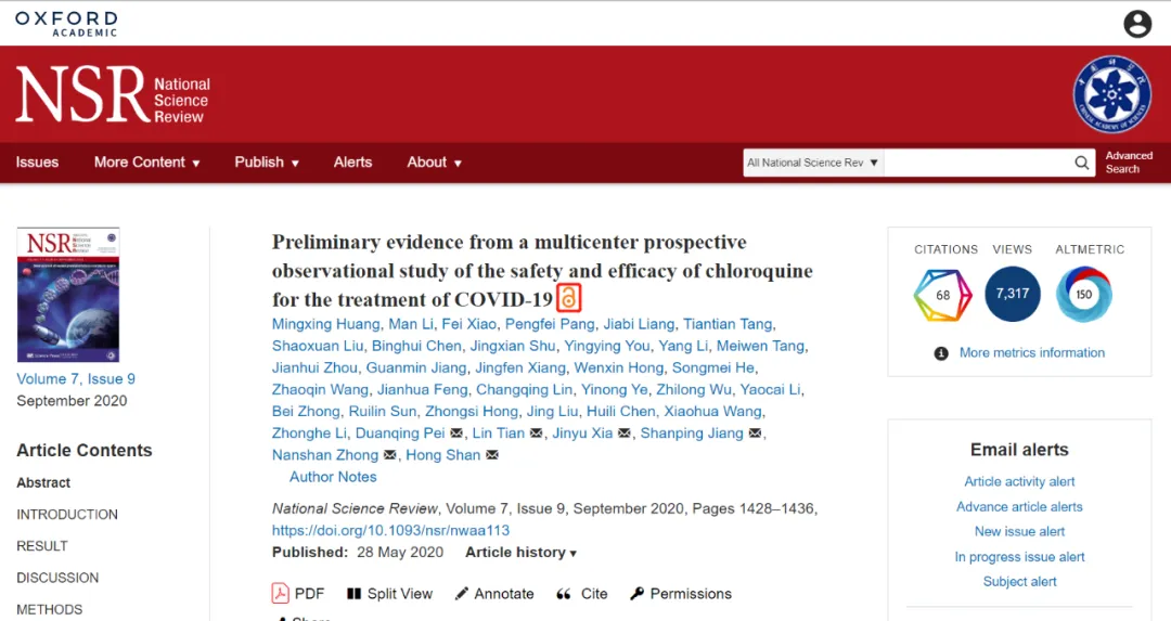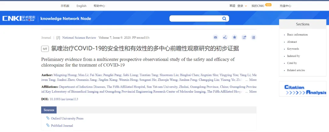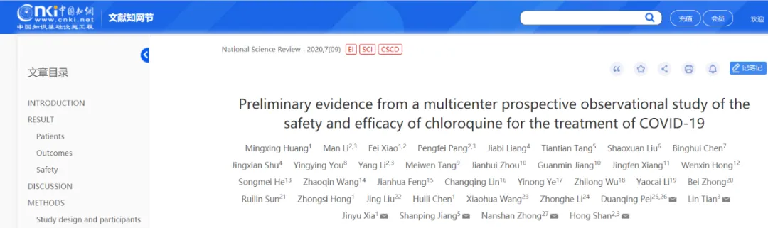 另一篇钟南山院士联合署名的文章“Strategies for reopening in the forthcoming COVID-19 era in China”也存在上述情况,在知网主站点需要收费1元,而在外文库可直接跳转至国外期刊库免费阅读。对此,小编进行了认真细致的查证:首先是这一篇Preliminary evidence from a multicenter prospective observational study of the safety and efficacy of chloroquine for the treatment of COVID-19