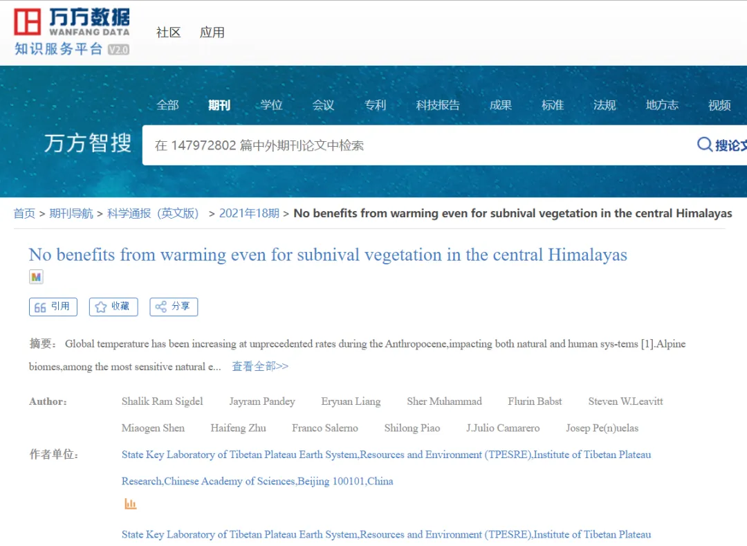 根据每日经济新闻消息:除钟南山院士的论文外,2021年新增“最年轻两院院士”、45岁的朴世龙与他人合著的论文《No benefits from warming even for subnival vegetation in the central Himalayas 》也存在同样的问题:在万方数据库中这篇文献的所属期刊明确写着:科学通报(英文版),又是一篇发在国刊SCI上的OA论文。