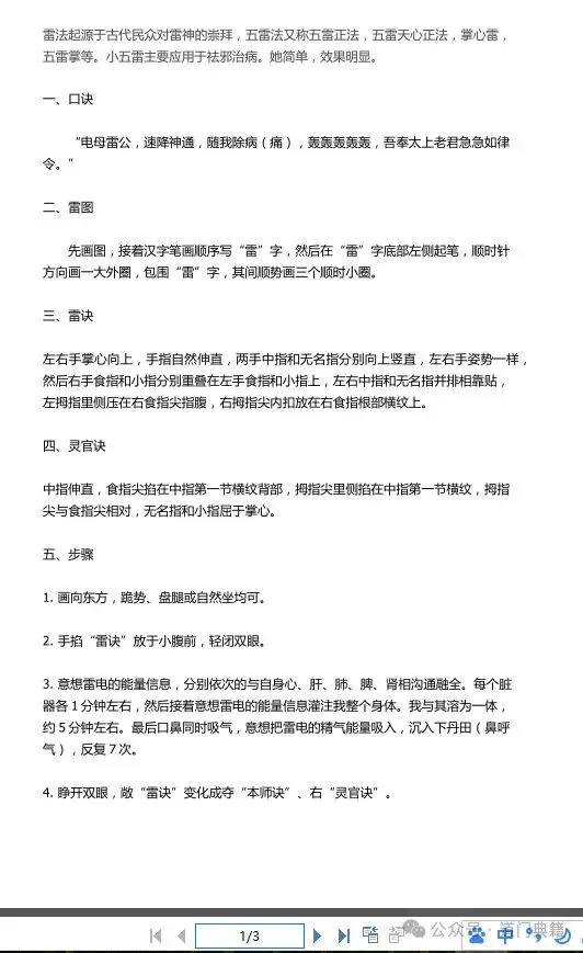 一、口诀 “电母雷公,速降神通,随我除病(痛),轰轰轰轰轰,吾奉太上老君急急如律令。”