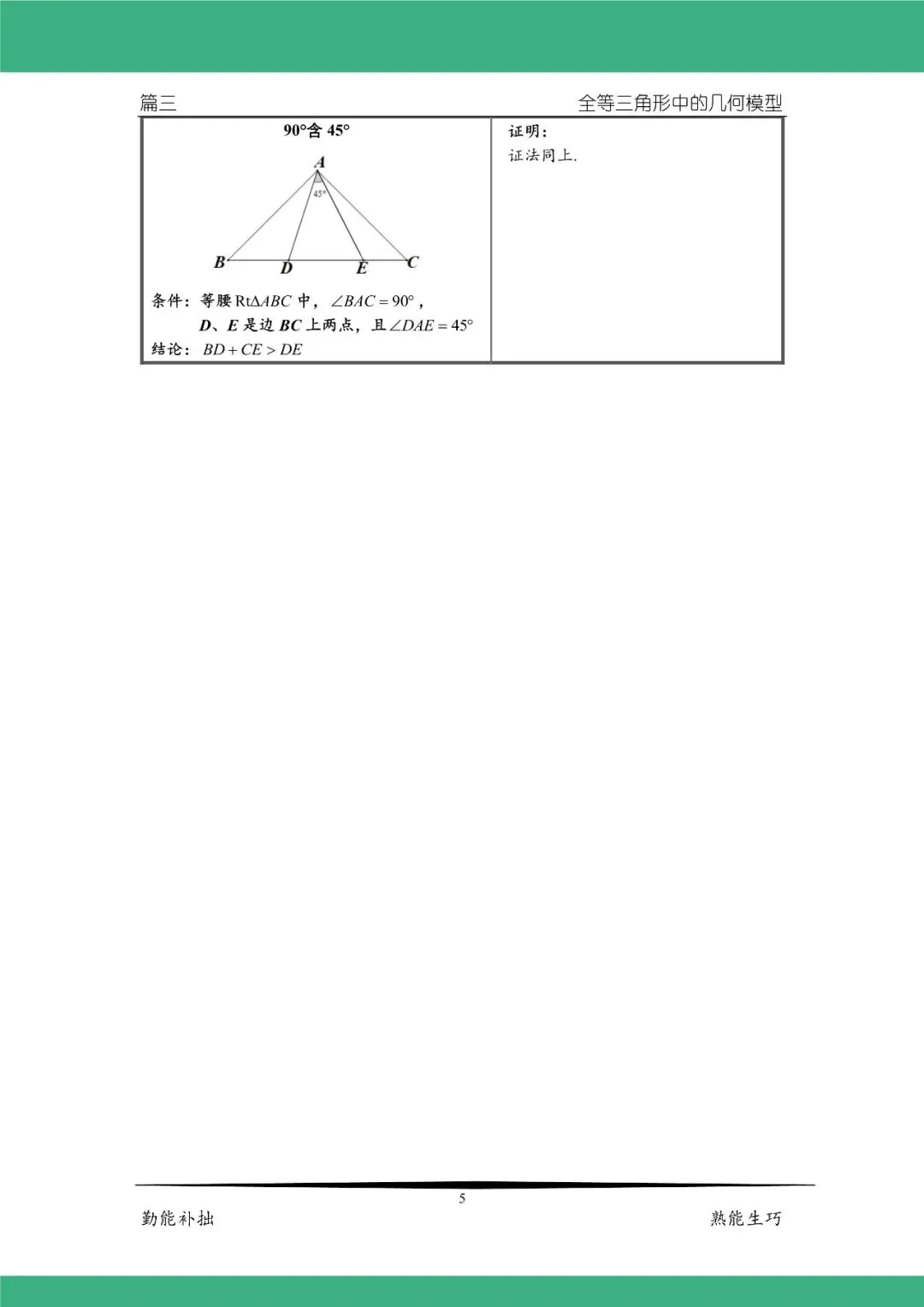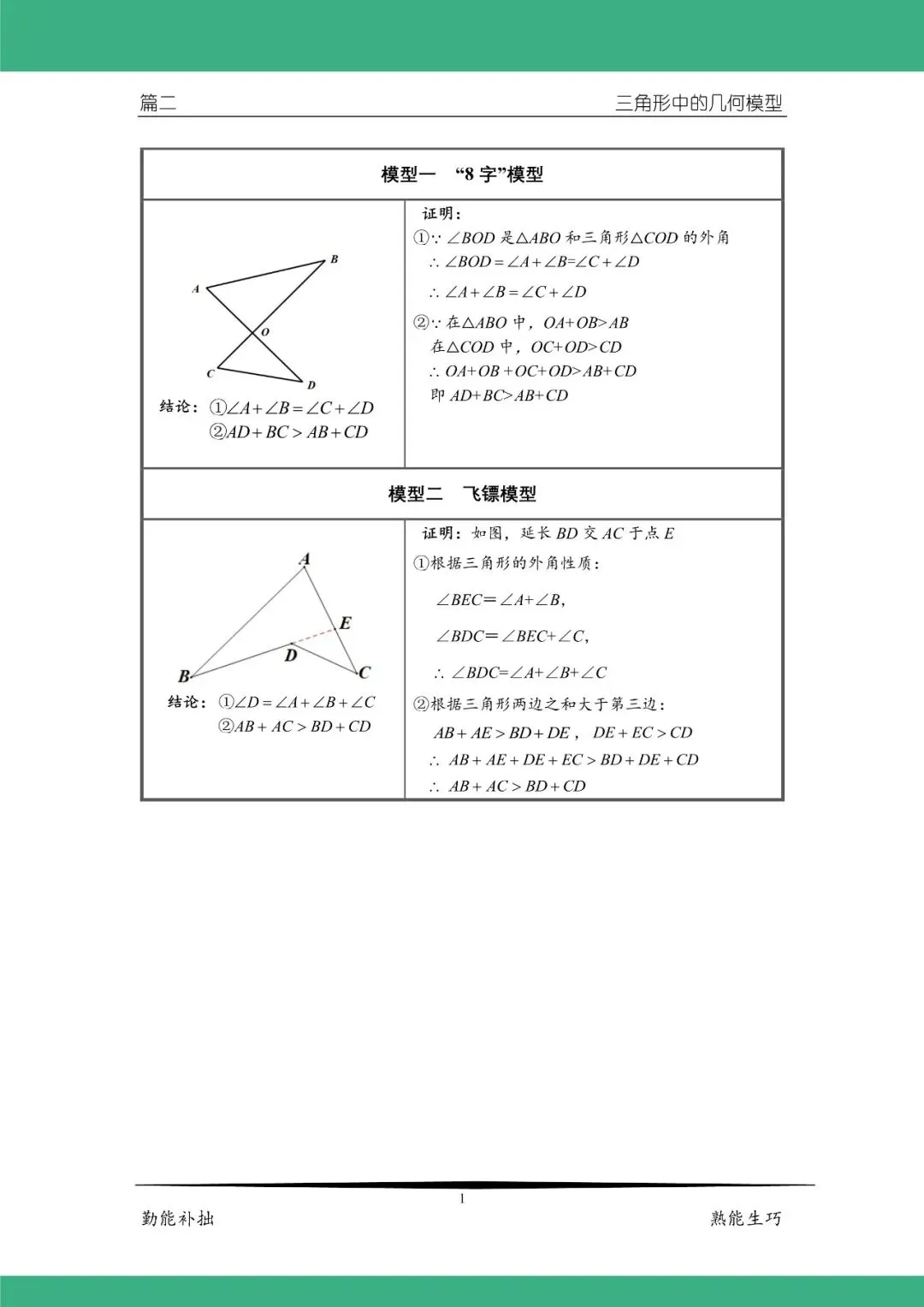 合肥的初三家长们,最近是不是都被娃的一模数学成绩愁坏了?刚结束的蜀山、庐阳、包河等区一模卷,不少家长跟我说:“孩子基础题都能做对,一碰到几何题就卡壳,选择填空压轴题靠蒙,大题最后两道直接空着,数学怎么都冲不上 110+”。其实不止是一模,翻看近 5 年安徽中考数学真题,你就会发现:几何模块,永远是中考数学的拉分王。整张试卷 150 分,几何相关题目分值常年稳定在 65-70 分,占比接近 45%;选择填空的最后一道压轴题、解答题的倒数两道综合大题,几乎全是几何模型的变式应用。毫不夸张地说,合肥娃想冲一中、一六八、七中这些重点高中,几何这一关,必须稳稳拿下。孩子几何刷百题还是不会?根源在这很多家长说,孩子几何题刷了几百道,错题本记了厚厚一本,可考试碰到新题还是无从下手。问题根本不是孩子不努力,而是没搞懂中考几何的底层逻辑 —— 模型思维。中考几何题,从来不会考原题,但 90% 的题目,都是课本基础模型的变式与组合。比如合肥一模刚考的几何压轴,本质就是手拉手模型 + 半角模型的组合;2025 年安徽中考的几何大题,核心就是一线三垂直模型的延伸。孩子没有把模型吃透,不知道辅助线怎么画,不知道核心结论怎么用,刷再多题也是白费功夫。今天给合肥的初三家长们,带来了这份专为 2026 安徽中考打磨的《九下数学中考 - 几何模型手册》,把中考 90% 的几何高频考点、必考模型、辅助线作法全部整理到位,娃吃透这份手册,几何题直接从 “无从下手” 变成 “秒出思路”!这份手册,帮合肥娃搞定中考几何全考点一、基础不丢分:平行线 6 大模型,小题 30 秒秒解这是几何入门的核心,也是中考选择填空必考题,很多孩子总在拐点问题上丢分。手册里把猪蹄模型、铅笔模型、靴子模型、尖尖角模型、左右角模型、橡皮擦模型全部梳理清楚,每个模型都有明确结论、完整证明过程,更总结了通用辅助线黄金法则 ——过拐点作平行,娃看完,碰到平行线拐点题,30 秒就能出答案。三角形是几何的基础,更是综合题的必考载体。手册里重点拆解了中考高频的8 字模型、角平分线 + 飞镖模型,不仅有角度关系核心结论,还有边长不等式规律,不管是角度计算、边长比较,还是和全等、相似结合的综合题,都能直接套用,帮孩子稳稳拿下中档题,不丢一分冤枉分。三、压轴题突破:全等三角形 4 大高频模型,直接拉开分差全等三角形是安徽中考几何压轴题的绝对核心,也是大多数孩子的失分重灾区。手册里把中考最常考的 4 大压轴模型,从条件、结论到证明、变式全拆解透彻:手拉手模型:等边三角形、等腰直角三角形、正方形、顶角相等的等腰三角形 4 种变式全覆盖,从全等证明,到角度结论、线段和差结论、角平分线规律全步骤拆解,合肥一模、安徽中考年年考的核心模型,娃吃透直接秒解;半角模型:90° 含 45°、120° 含 60°、等边三角形 30° 半角全涵盖,线段和差、三角形周长、面积、高的核心结论全部整理,旋转辅助线作法一步到位,彻底解决线段和差证明的压轴难题;一线三垂直 / 一线三等角模型:安徽中考高频考点,不仅有全等证明、线段数量关系结论,更是后续相似三角形的核心基础,手册里把正向、反向变式全部讲透,碰到坐标系几何题、动点题,直接找模型破题;婆氏模型:中考压轴题拔高考点,中点、垂直、线段数量关系、面积相等结论全拆解,帮孩子冲满分、拉开分差。四、万能破题法:辅助线作法 + 最值模型,再也不怕没思路很多孩子几何题不会做,核心就是不会画辅助线。手册里专门整理了中考几何万能辅助线作法,孩子碰到对应题型,直接套用就行:倍长中线法:碰到中点、中线,直接倍长构造 8 字全等,通用破题方法;截长补短法:解决线段和差倍分问题的万能方法,中考证明题必考;角平分线 4 大辅助线作法:作双垂、取等长、垂穿、平行出等腰,碰到角平分线,直接对应方法,再也不用瞎猜。还有孩子最怕的 “将军饮马” 轴对称最值模型,手册里把线段和最小、线段差最大的所有题型全部归类,作图方法、原理说明清清楚楚,不管是单动点、双动点,还是平移类最值问题,娃看完都能找到解题思路。高清可打印 PDF,免费领取方式