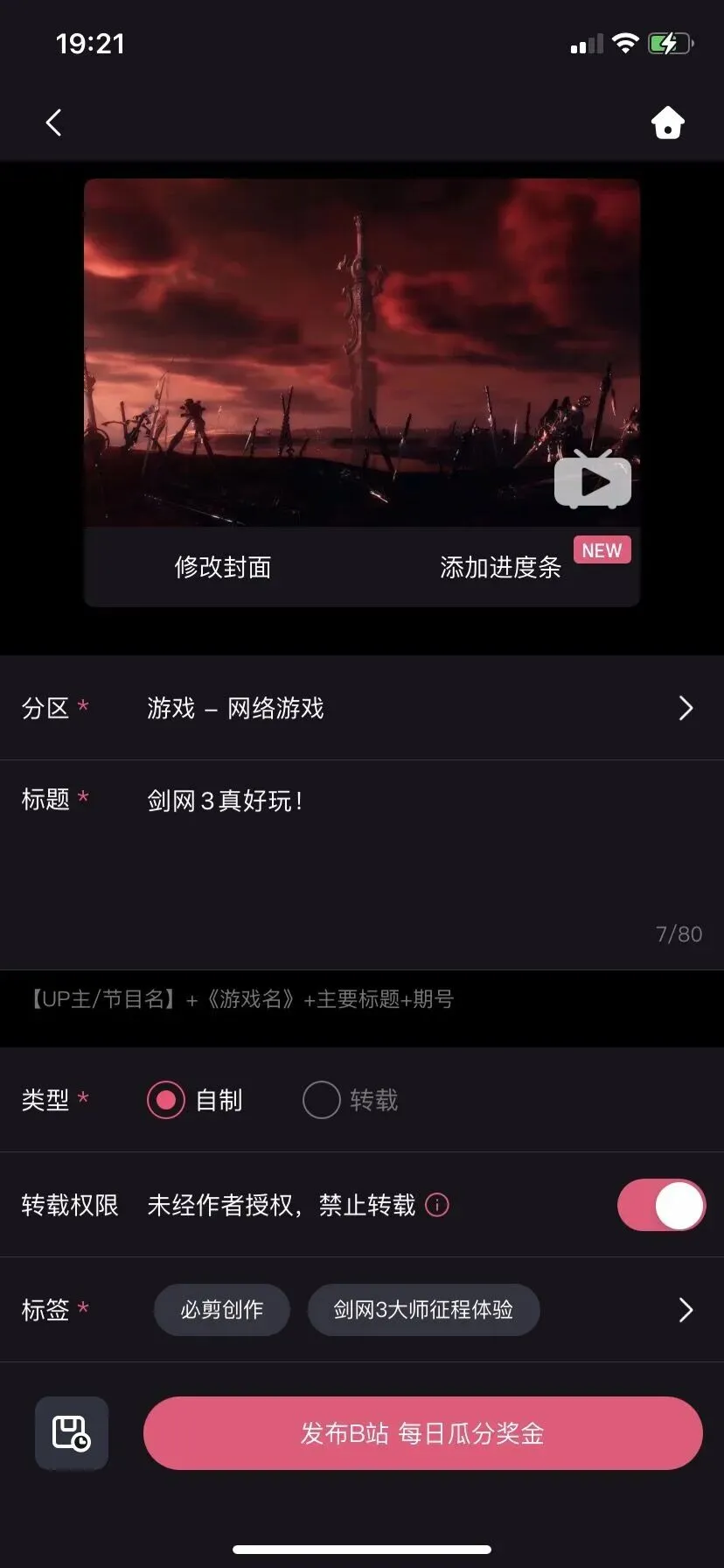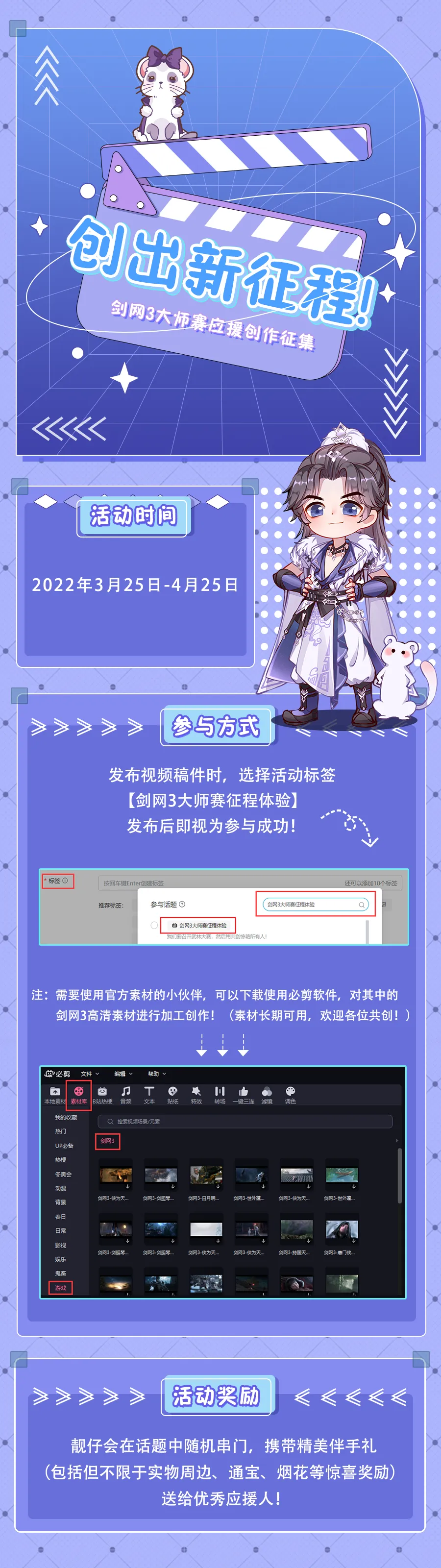 参与方式:发布视频稿件时,选择活动标签【剑网3大师赛征程体验】,发布后即视为参与成功!