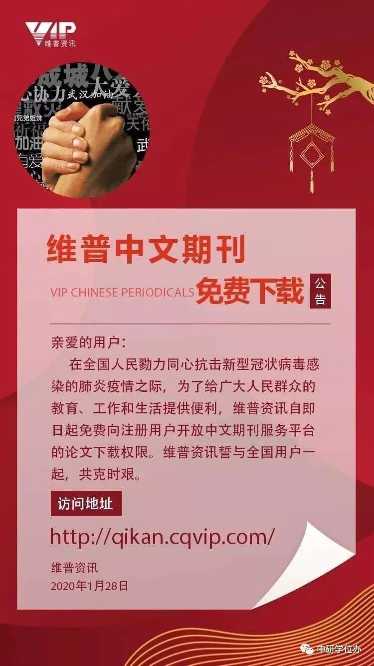 为抗击疫情,创新服务,中国知网、维普中文期刊开通免费下载文献途径。转发给您们,供您们使用。