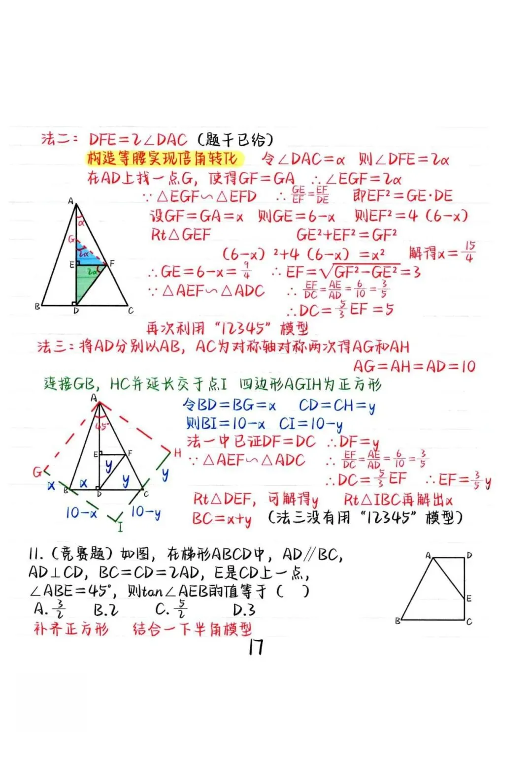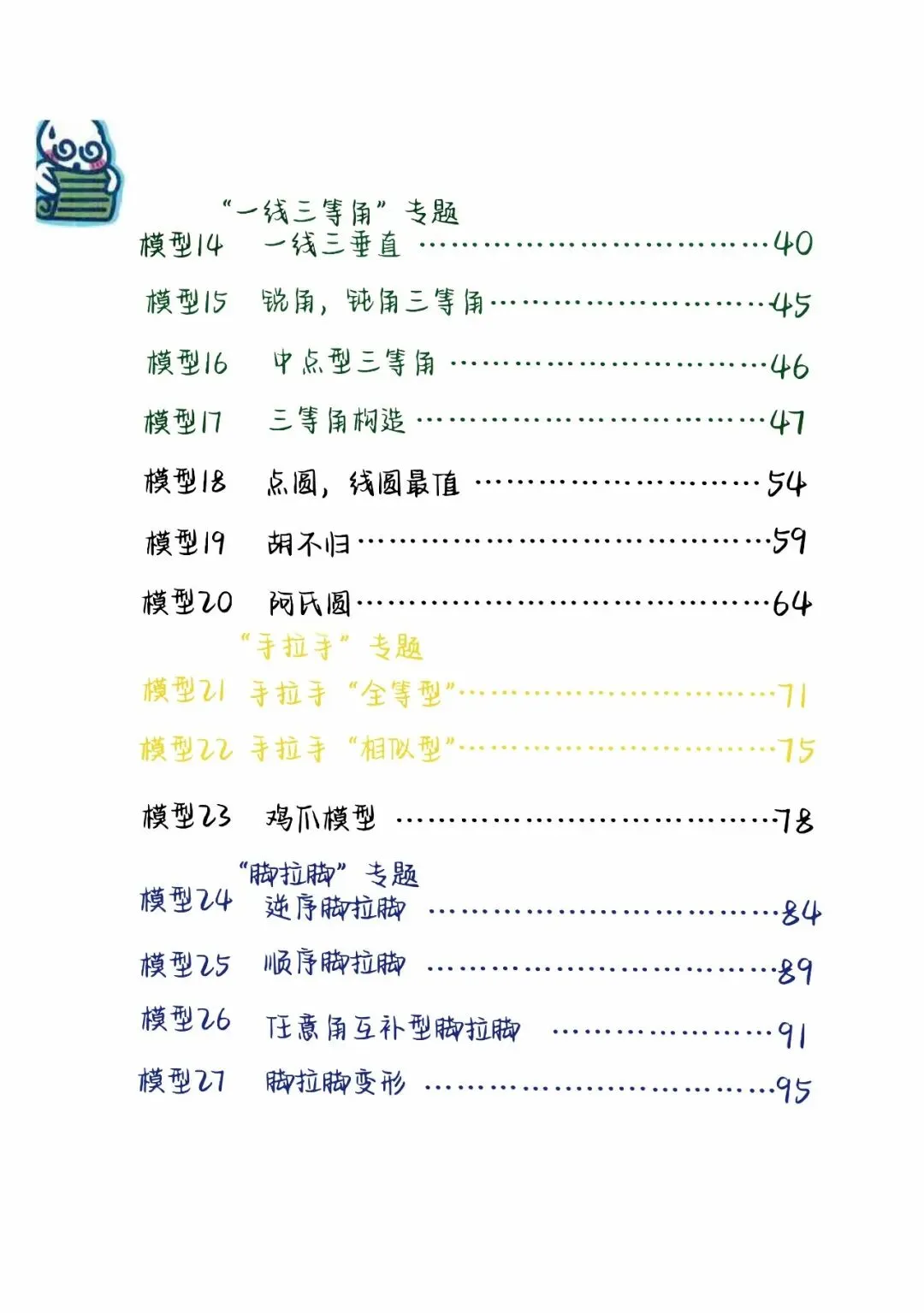 最近是不是刚陪孩子熬完一模、月考?数学卷子翻开来,是不是大半的丢分,都栽在了几何题上?后台每天都能收到合肥家长的留言,字字都是同款焦虑:“孩子在四十五中读初二,几何一考就崩,填空压轴直接放弃,大题连辅助线都画不出来”“寿春的模考卷,最后两道几何压轴题,孩子只能写个‘解’,一半分都拿不到”“想冲一六八,数学至少要稳 140+,结果光几何就扣了十几分,直接被拉开差距”“模型口诀背了一大本,刷题刷了上百道,题目稍微变个样,孩子还是两眼一抹黑”相信在合肥,家里有初中生的家长,几乎都被孩子的数学几何问题困住过。在合肥初中圈有句公认的话:得几何者,得中考数学。安徽中考数学满分 150 分,单单几何模块就占到了 60-70 分,选择填空压轴、大题最后两道拉分题,几乎全是几何模型的综合应用。毫不夸张地说,几何就是合肥初中生数学分层的核心分水岭 —— 基础差的孩子,几何直接丢一半分;中等生卡在变式题,始终突破不了瓶颈;想冲一六八等名校的尖子生,也往往因为几何压轴题的小失误,和目标失之交臂。为什么孩子刷了无数题,还是学不好几何?我们接触了合肥四十五中、四十二中、寿春中学、一六八初中部等名校上千名学生后发现,孩子几何学不好,从来不是不努力、不是笨,而是踩中了这 3 个核心误区,越学越偏:网上随便搜的几何资料,要么是全国通用的泛泛内容,要么超纲偏离安徽中考考点,根本贴合不上合肥本地的教研重点和命题偏好。孩子刷了几百道题,却没碰中中考核心考点,白白浪费了宝贵的课内时间。很多孩子把将军饮马、手拉手的口诀背得滚瓜烂熟,却不知道模型的推导原理,更不知道辅助线为什么要这么画。安徽中考的几何题,从来不会考原题,全是模型的变式考法,题目稍微换个场景、叠个条件,孩子就直接认不出来、无从下手。学校课堂上,几何是分章节拆解教学的,三角形、四边形、圆分开讲,孩子学会了单个知识点,却摸不透各个模型之间的关联。而合肥中考的几何压轴题,从来都是多个模型叠加考察,孩子单个知识点会,一到综合题就彻底懵圈,根本串不起来解题思路。合肥孩子几何提分的核心:找对方法,比盲目刷 1000 道题更有用其实安徽中考的几何题,看似千变万化,实则万变不离其宗。近 5 年的中考真题、合肥名校的模考卷翻遍就会发现:所有几何题,都有固定的核心模型和标准解题套路。孩子只要吃透这些核心模型,掌握 “识别题型特征→锁定对应模型→画对辅助线→套用标准步骤解题” 的完整逻辑,哪怕是最后一道压轴题,也能快速找到突破口,稳稳拿到步骤分甚至满分。而我们专为合肥初中生打磨的这份 **《合肥中考数学几何全模型通关手册》**,就是帮孩子攻克几何难关、实现数学提分的核心利器。这不是一份网上随处可见的通用模型合集,而是完完全全对标安徽中考、贴合合肥本地教研、专为合肥初中生量身打造的几何提分宝典。✅ 20 + 中考核心模型全覆盖,100% 匹配安徽中考考点手册里囊括了安徽中考几何模块的全部核心考点,从基础必拿分的将军饮马、点圆最值,到全等 / 相似核心的手拉手、半角模型、一线三等角、对角互补模型,再到压轴题必考的胡不归、阿氏圆、瓜豆原理、费马点,中考考什么,我们就讲什么,不做无用的超纲延伸。更重要的是,每个模型我们都标注了安徽中考考察频率,必考点、高频考点一目了然,帮孩子精准抓重点,不用在冷门知识点上浪费时间。很多孩子觉得几何难,核心就是卡在 “不会画辅助线、不会套模型”。这份手册里,我们把每个模型都拆解得明明白白:模型底层原理与推导过程,让孩子不仅知其然,更知其所以然题型识别特征,教孩子一眼看穿题目背后对应的模型,不再瞎猜辅助线固定画法,给孩子标准化的解题思路,不用再靠灵感碰运气标准解题步骤拆解,从审题到写答案,每一步都清清楚楚,基础薄弱也能跟上✅ 全是合肥本地真题适配,刷的每一道题都贴合中考方向手册里的所有例题、配套练习题,全部精选自安徽近 5 年中考真题、合肥四十五中 / 四十二中 / 寿春中学 / 一六八初中部等顶流名校的月考、模考、期中期末卷,完全贴合合肥本地的命题逻辑和教研重点。孩子刷的每一道题,都是中考高频考察的题型,告别无效刷题,把时间都用在刀刃上。模型背了很多,但考试不会变通,中等分数瓶颈突破不了的孩子即将参加中考,想针对性突击几何模块,实现快速提分的初三孩子高清可打印 PDF,免费领取方式