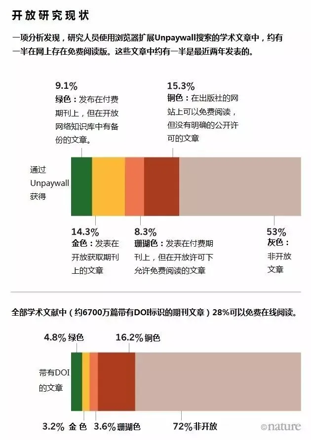 研究作者分析了 Unpaywall 用户在 6 月的一周内尝试访问的 10 万篇论文的服务器日志,发现有 47% 的被访问文章在网上存在合法的免费阅读版。Priem 说,这些可免费访问的内容,约有一半是在最近两年发表的。