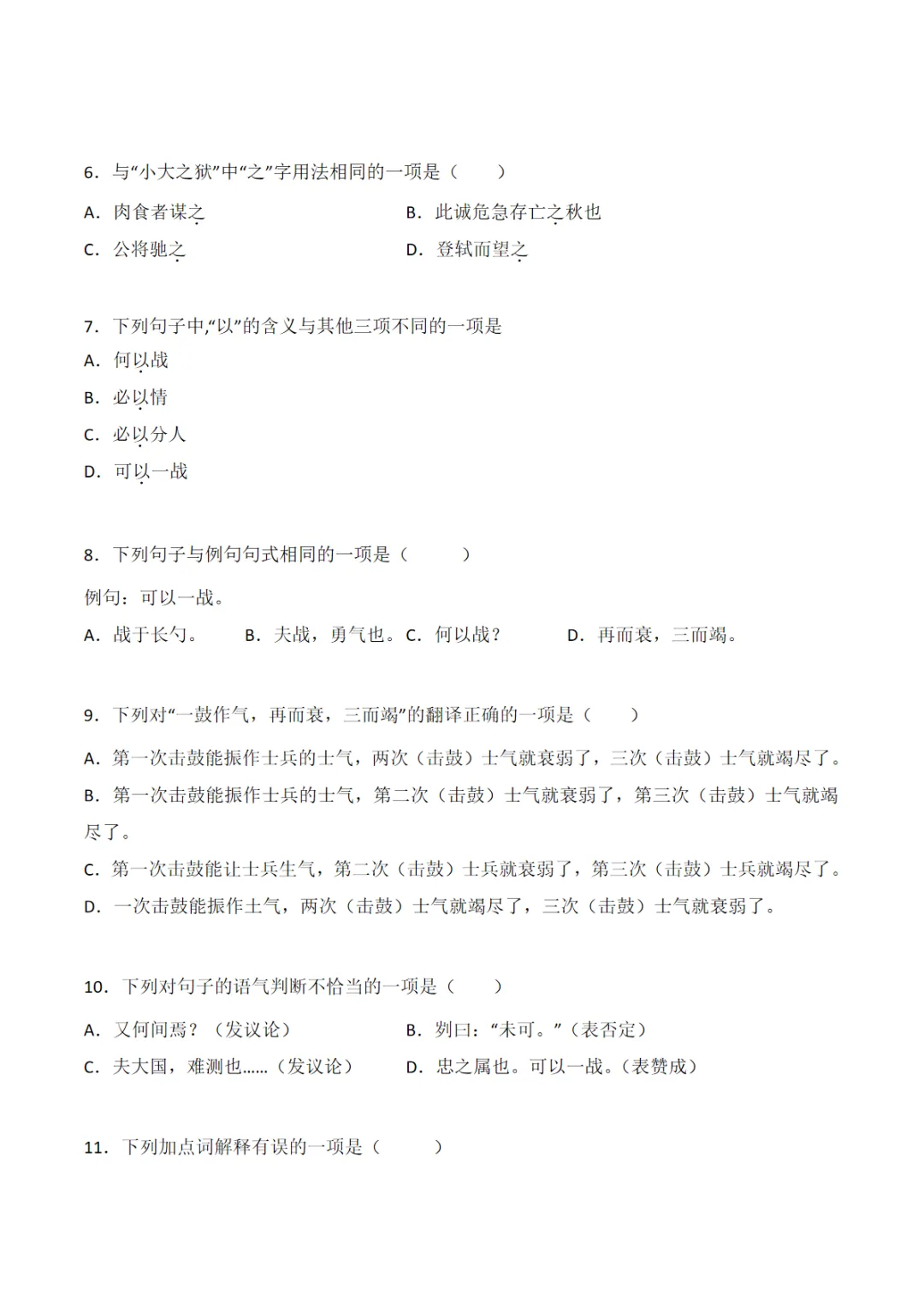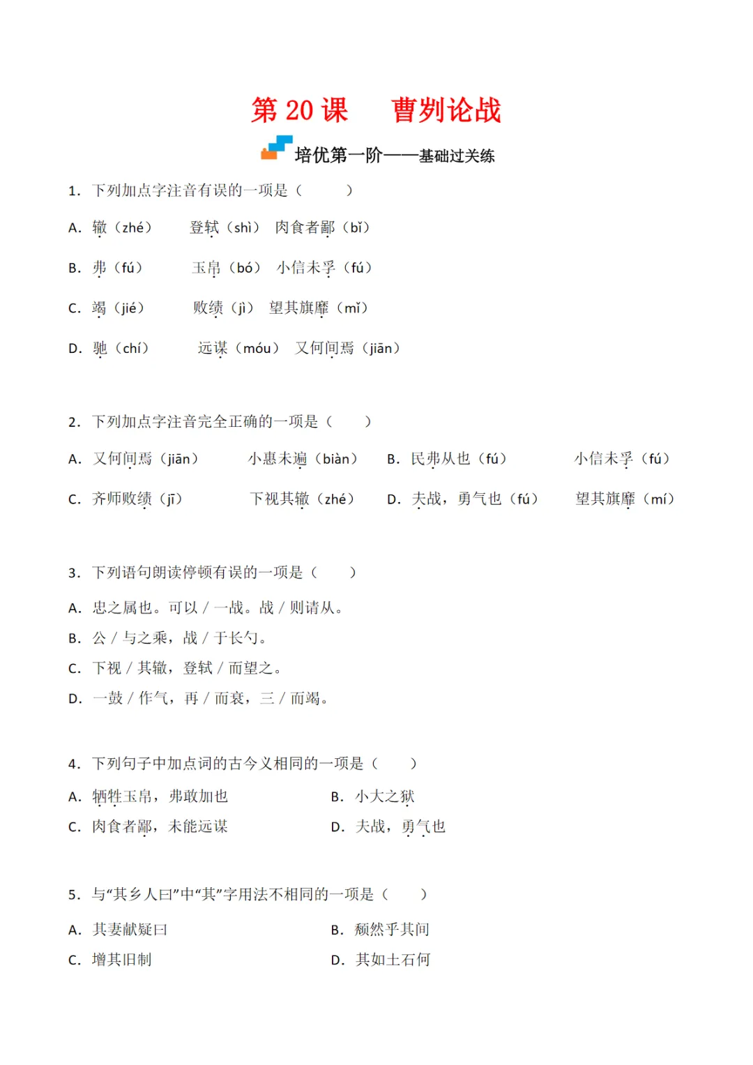 九年级(下)语文 第20课 《曹刿论战》同步培优练习