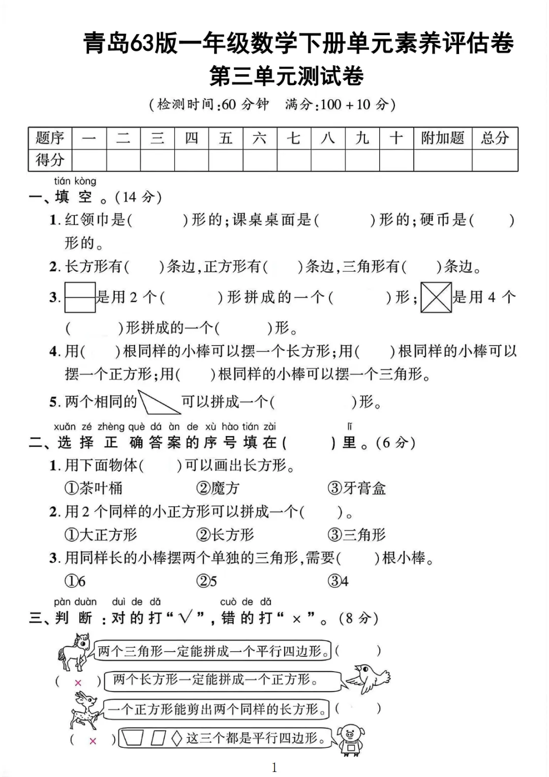 【免费下载】一年级(下)数学 第三单元拔尖测试卷《青岛63版》,PDF电子版,共8页,可打印