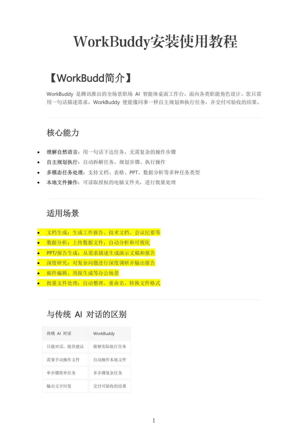 这是一份关于腾讯WorkBuddy职场AI智能体桌面工作台的安装使用教程,介绍了其核心能力、安装步骤及基础操作方法,清晰展现了这款工具与传统AI对话的差异和办公实用性。