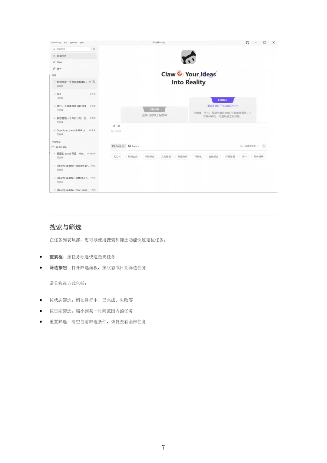 安装该工具仅需三步,从指定官网下载安装包,完成安装后注册登录即可进入操作界面。基础使用主要围绕创建任务、任务管理、任务对话和结果查看展开:创建任务时用一句话描述需求即可,也可指定工作目录、通过引用文件、上传截图等方式添加上下文,明确输出格式、约束条件等信息;任务列表会展示所有创建的任务,可按标题搜索、按状态和日期筛选,任务有进行中、已完成等多种状态,支持继续处理已有任务以延续上下文。