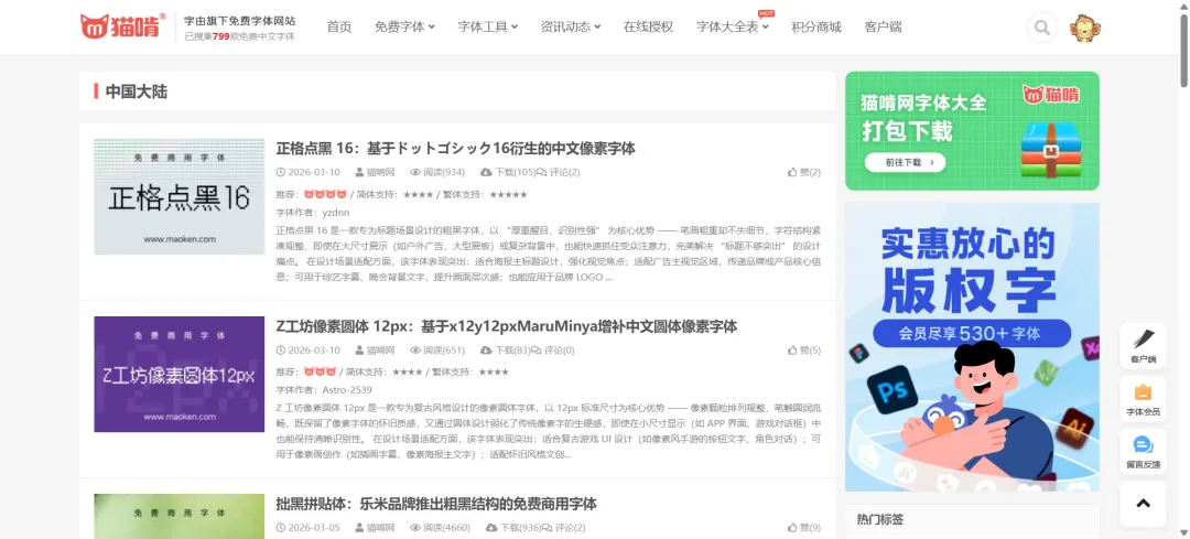 如果大家主要需求是中文免费字体,猫啃网绝对是首选平台,它是国内专门做中文免费商用字体整理的垂直网站,定位清晰,每一款上架字体都经过人工核验授权,确保真实有效,是我日常找免费无版权字体下载的主力网站,尤其适合不熟悉字体版权的新手。