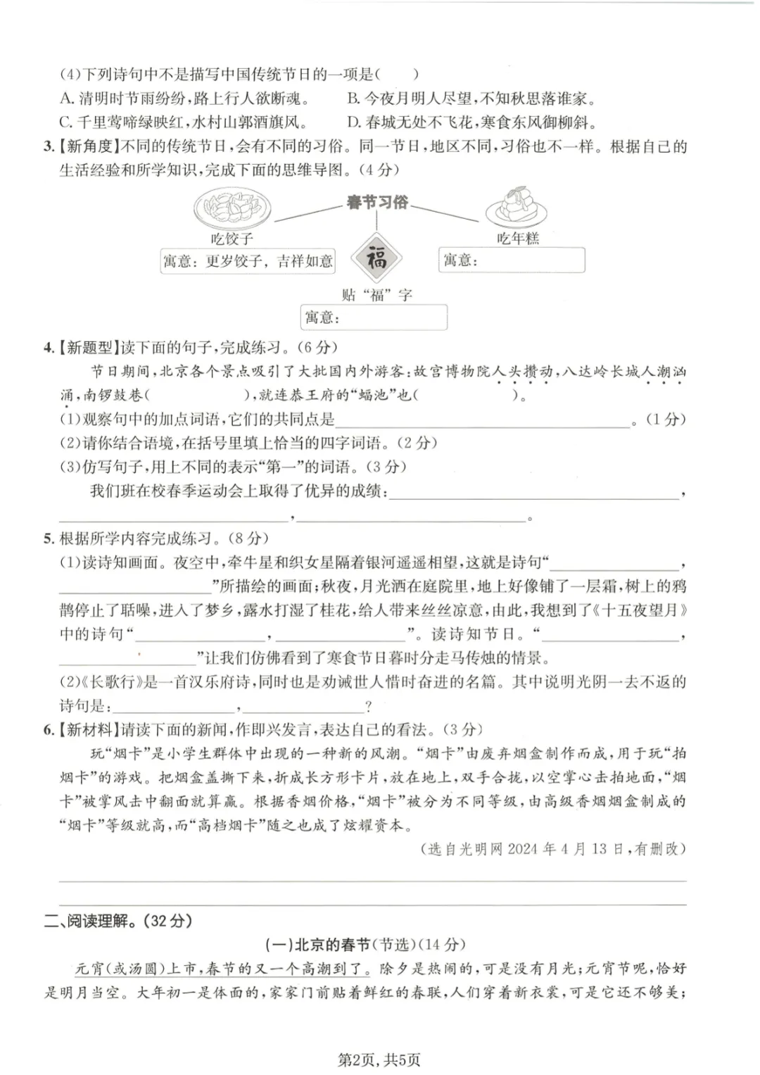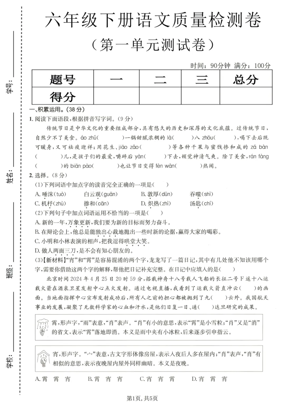 【免费下载】六年级(下)语文 第一单元质量检测卷,PDF电子版,共5页,可打印