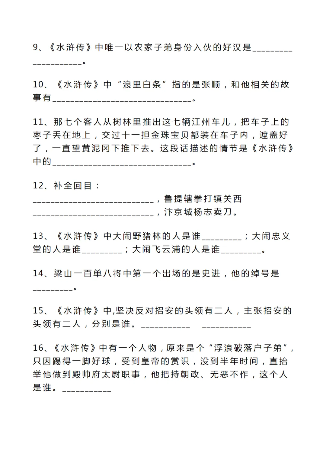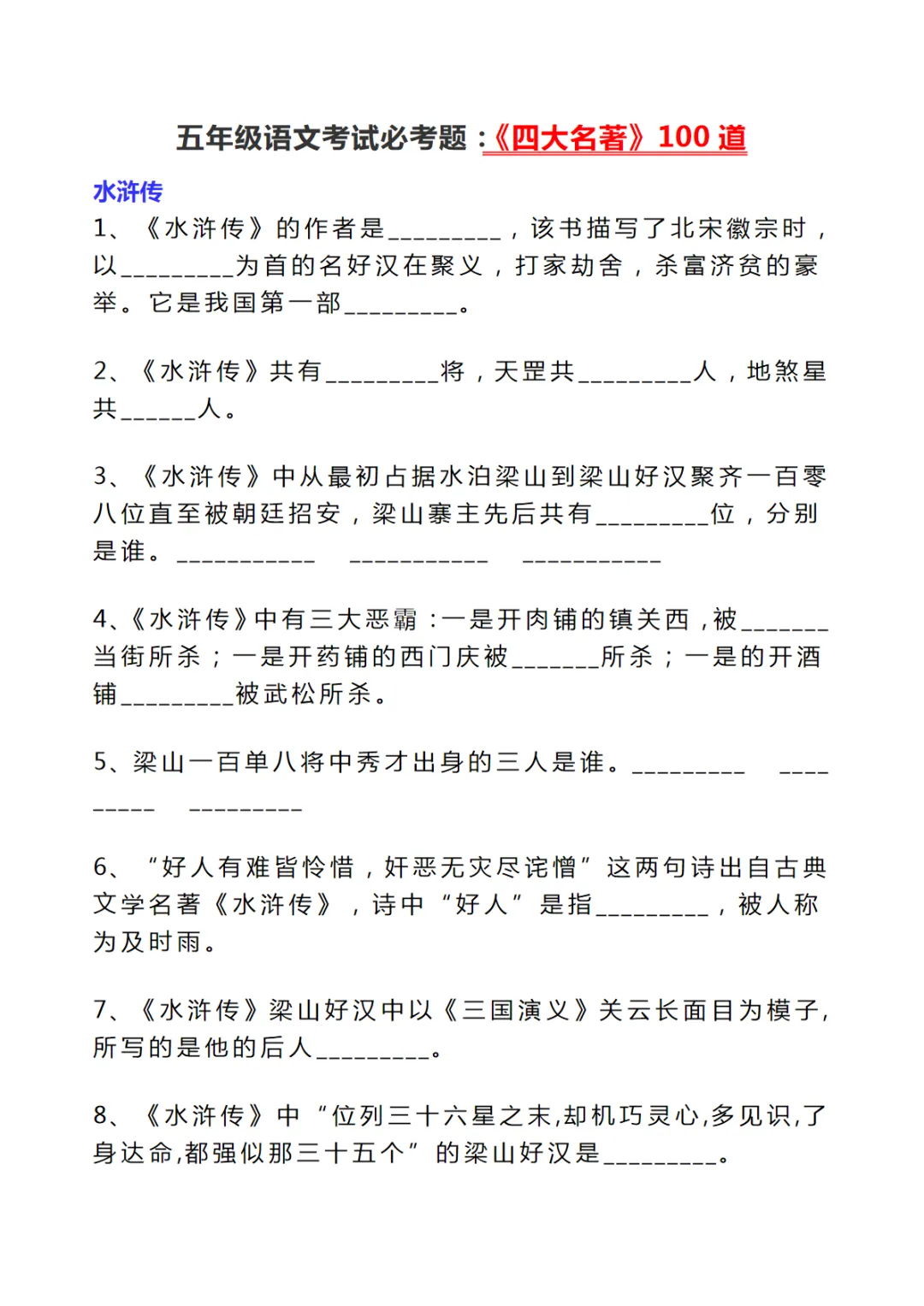 【免费下载】五年级(下)语文 考试必考题:《四大名著》100道,PDF电子版,共16页,可打印