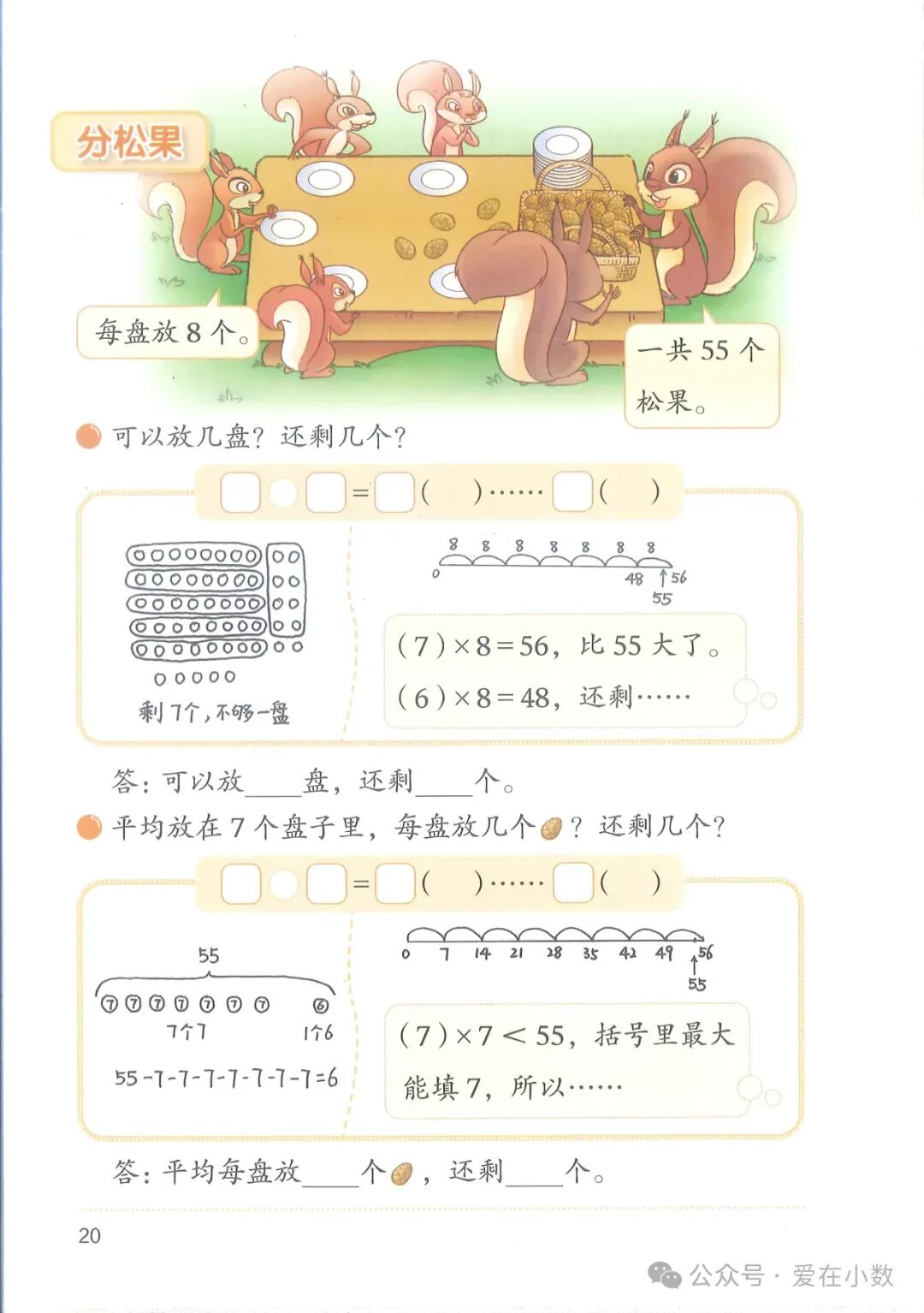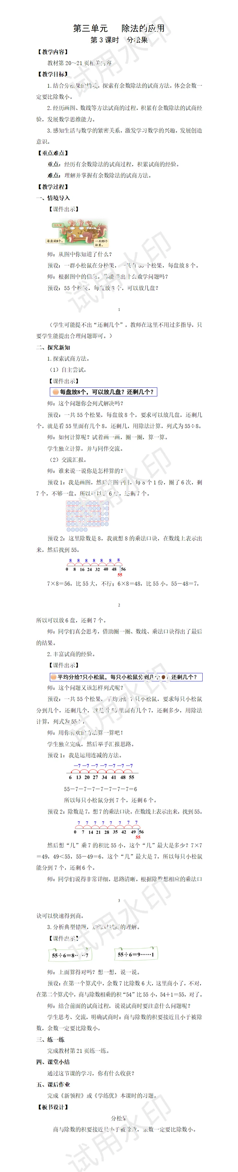 本节课是学习试商,我利用教材创设的分松果的情境,让学生结合现实情境,探索试商方法,积累试商经验。但是在一开始,很多学生无法灵活应用乘法口诀试商,有的学生甚至不知道应该怎么做,因此我给学生提供了足够的时间、空间去交流,让学生在相互学习的过程中理解试商方法,积累试商经验。通过课堂练习,发现绝大部分学生都能灵活试商,个别学生存在“商大”“商小”的问题,针对这些学生,可以在平时上课中,多让他们发言,帮助他们逐步突破这个问题。
