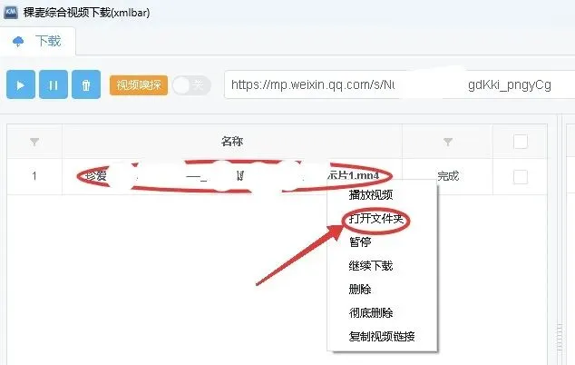 下载好视频之后,在列表中会显示下载视频。选中,鼠标右键,选中【打开文件夹】,找到下载的视频存放位置。