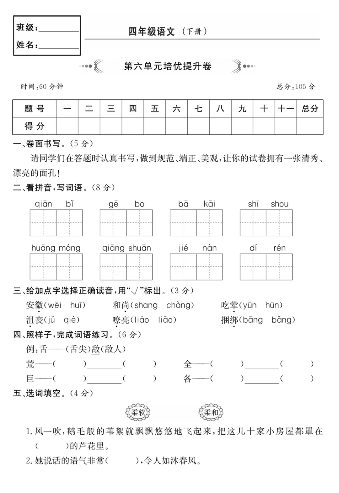 【免费下载】四年级(下)语文 第六单元培优提升卷,PDF电子版,共5页,可打印