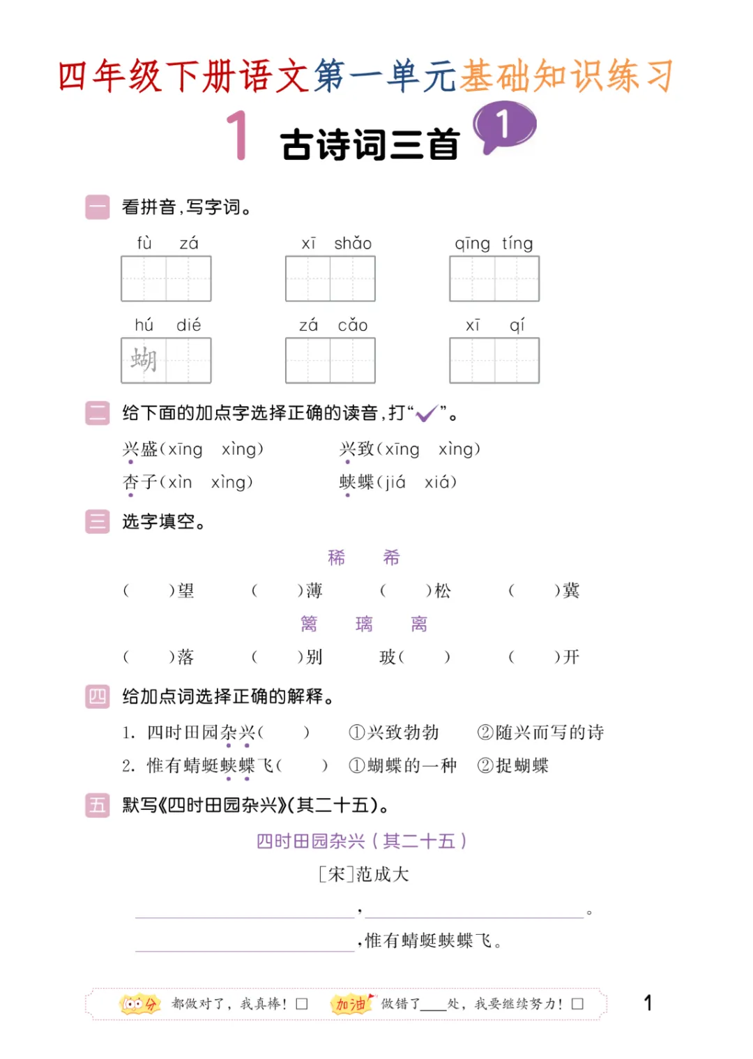 【免费下载】四年级(下)语文 第一单元每课基础知识练习,PDF电子版,共11页,可打印