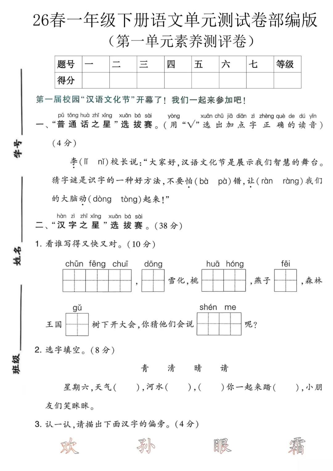 【免费下载】一年级(下)语文 第一单元素养测评卷《部编版》,PDF电子版,共6页,可打印