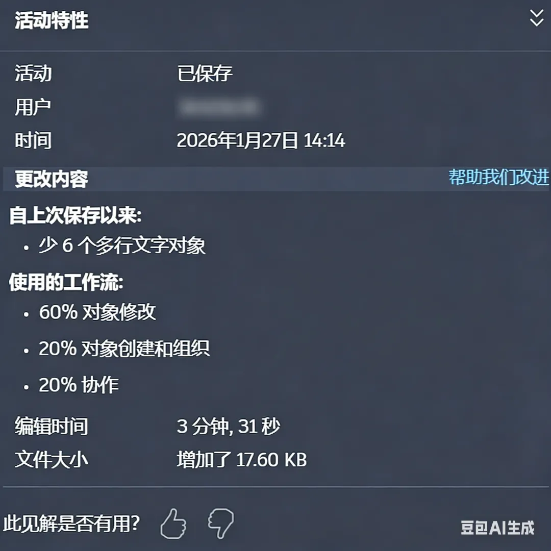 新的“更改内容"见解概述了在“保存的活动”之间所做的编辑,从而允许您高效地继续工作。