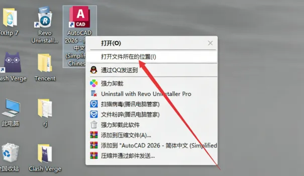 在电脑桌面找到AutoCAD 2026,鼠标右键打开文件所在的位置进入