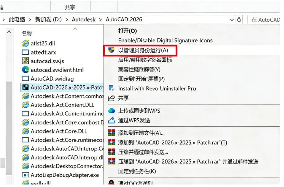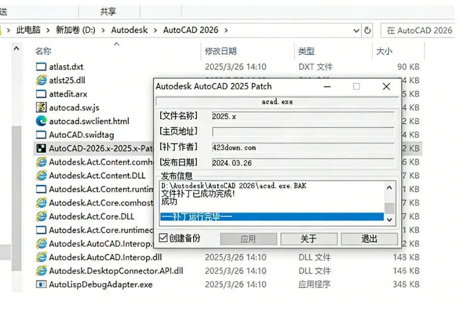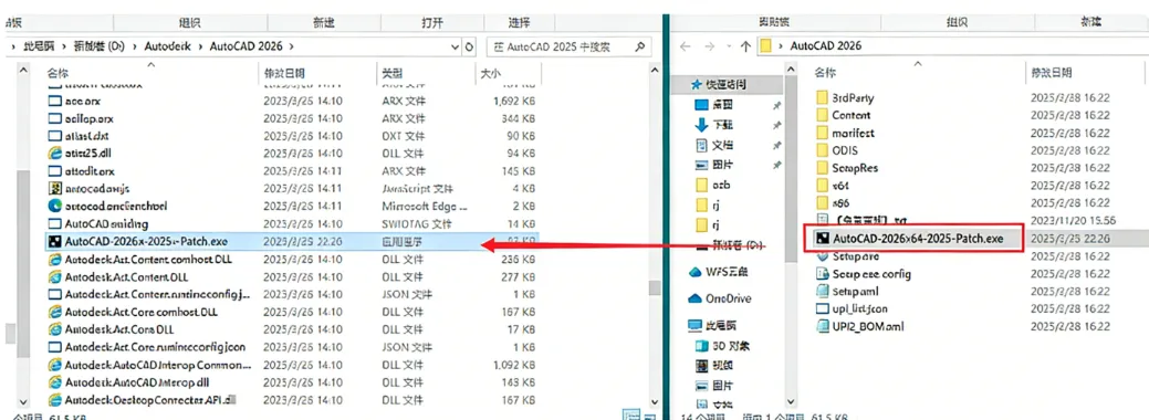 将安装包的【AutoCAD-2026.x-2025.x-Patch.exe】(*注意:如果你安装包没有的话,就是你没有关闭杀毒软件及防火墙导致的)复制到刚才打开的软件安装目录位置