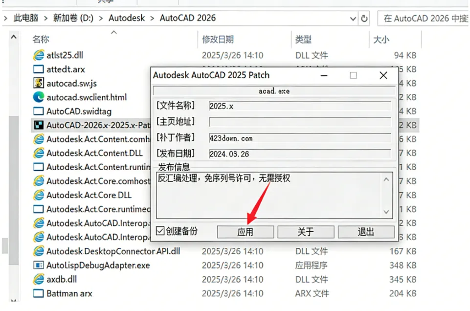 点击【应用】开始破解(*特别说明:本注册机虽然写着Autodesk AutoCAD 2025 Patch,同样适用于CAD 2026版本)